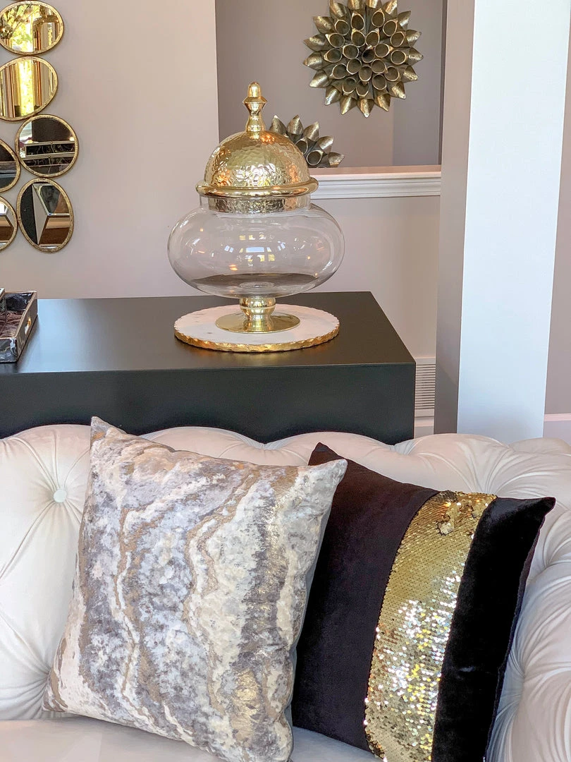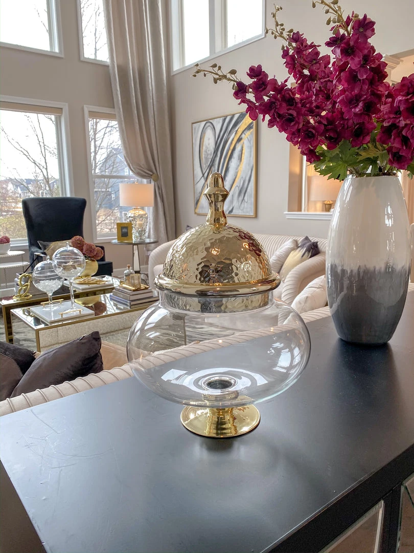 Pictured to the left is this beautiful over-sized Apothecary Jar with an elegant Gold Hammered Lid. Give your family room or any room the classic touch it’s desiring!Â