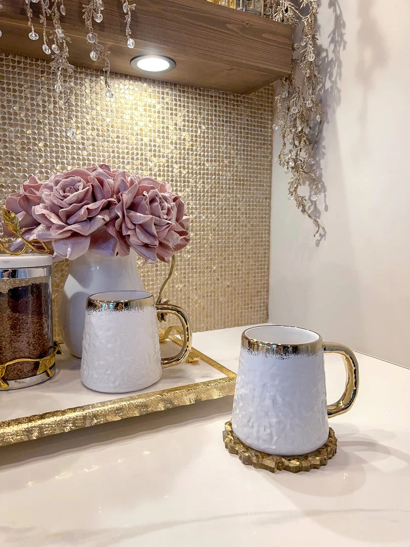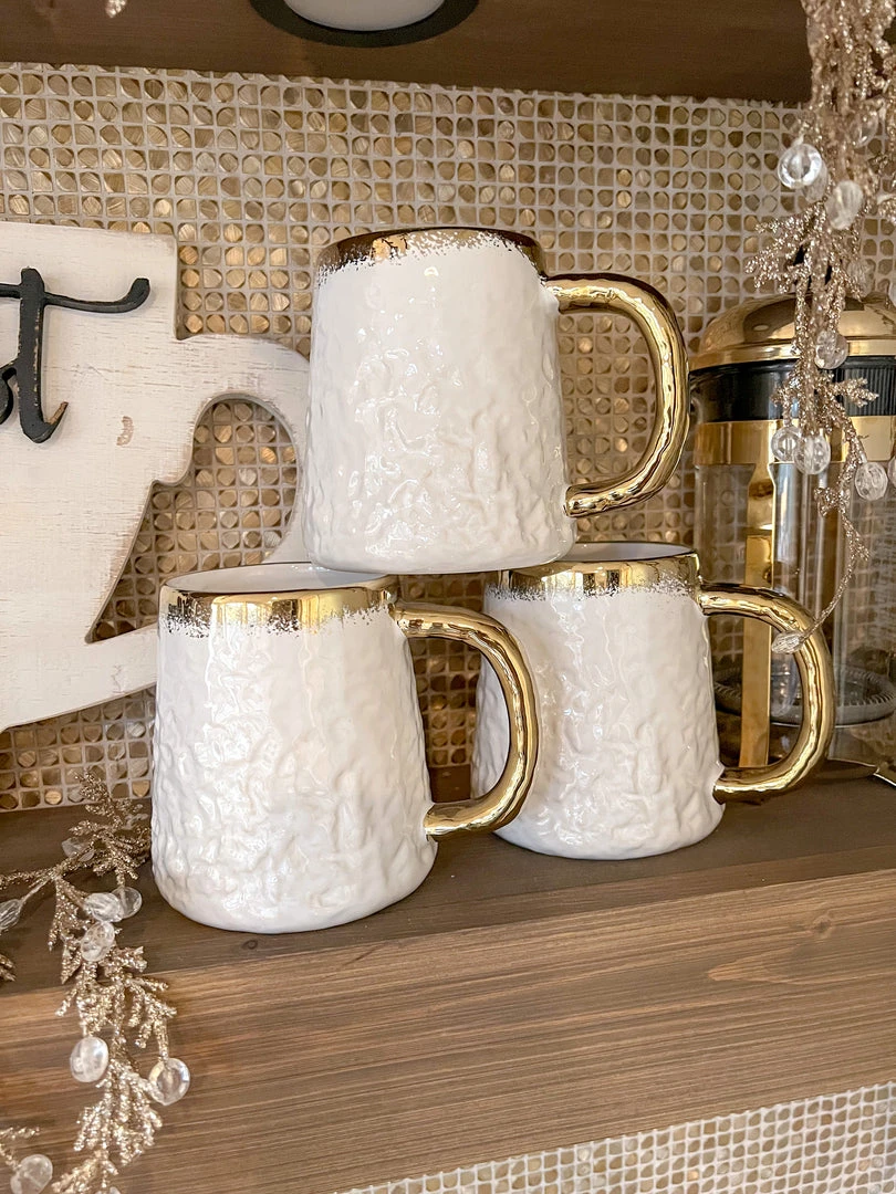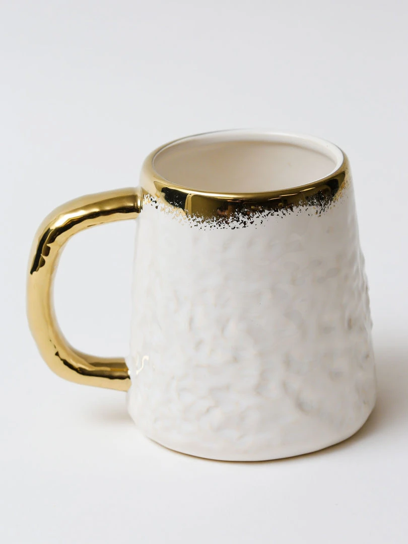 Description: This is a gorgeous oversized white coffee mug with beautiful gold trim.Â