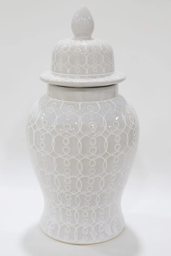 Description: This white ginger jar is a very substantial piece. It stands at 25″ high! This piece is perfect for holding your taller faux floral stems or just to style on its own next to your favorite decor.