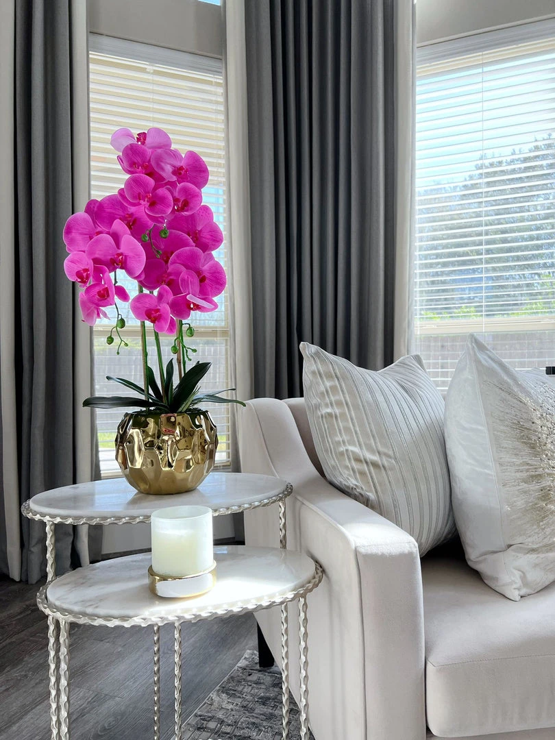Description: This gold potted faux pink Orchid is perfect for every season’s decor! The size is perfect for placing anywhere around your home!