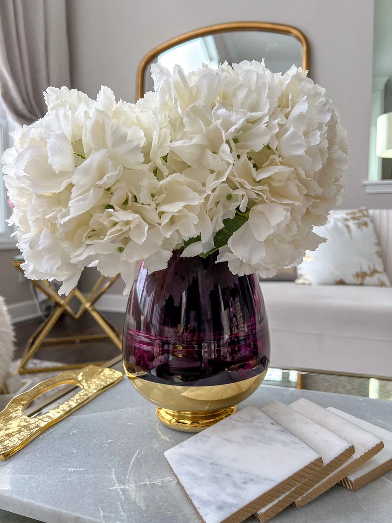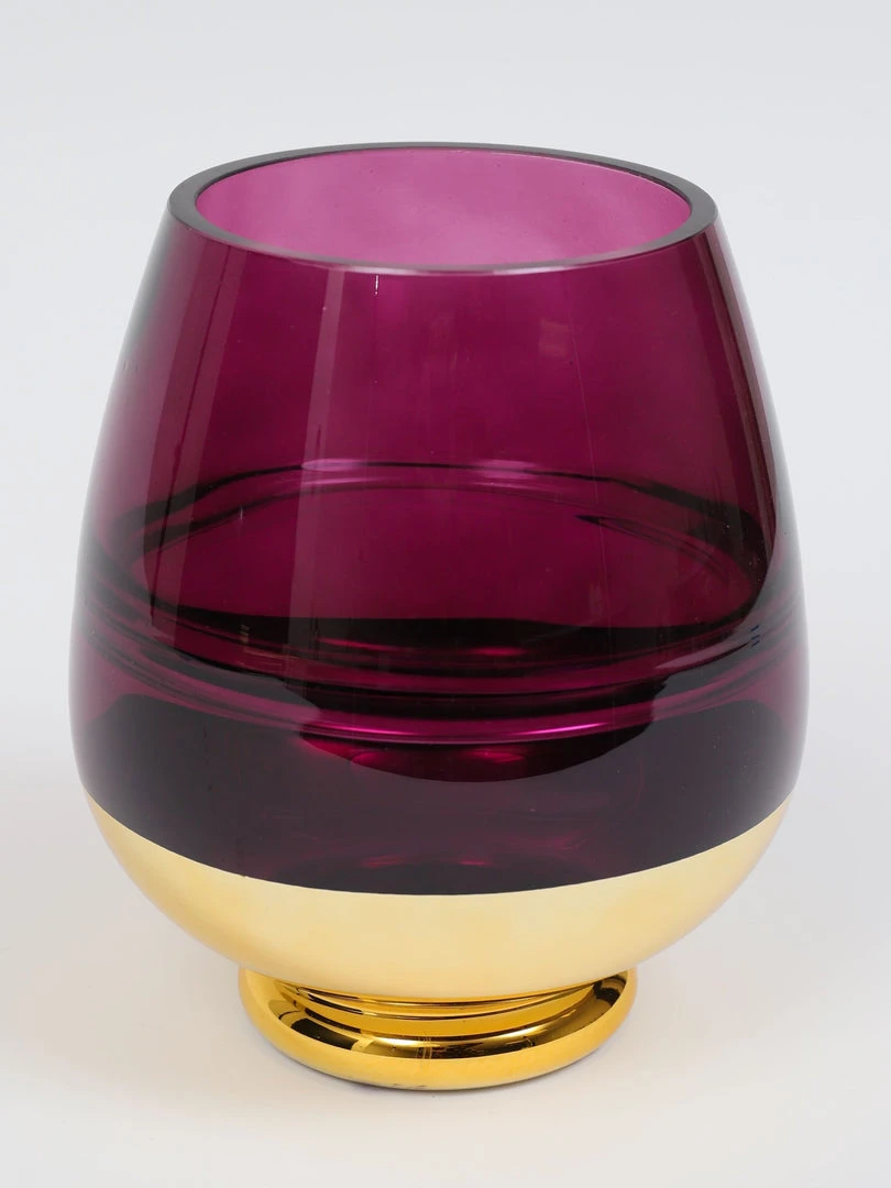 Description: The vibrant purple vase is simply beautiful with its golden base. Add a little pop of color just in time for Spring!