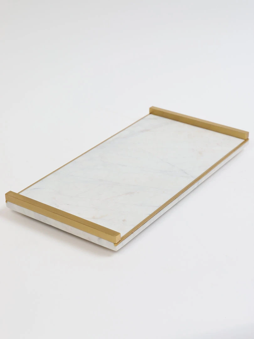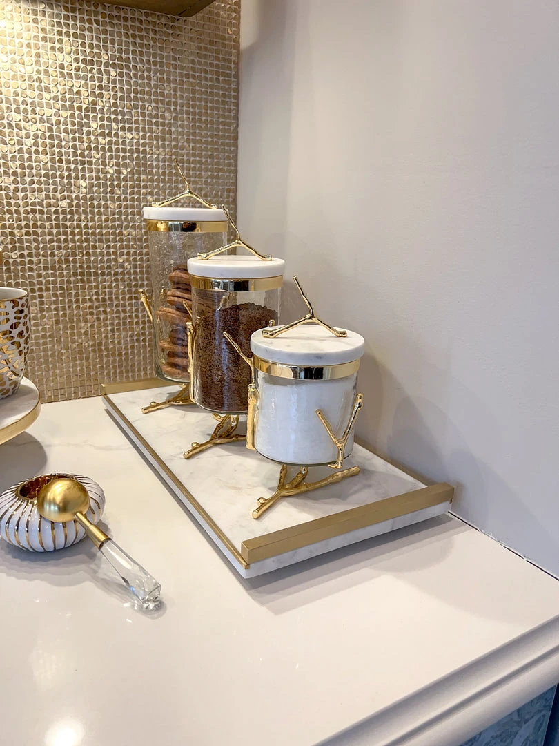 Description: This white marble tray features gold handles and a beautiful gold edge. It is simple yet elegant and very versatile in its use. Perfect to hold your canister sets!