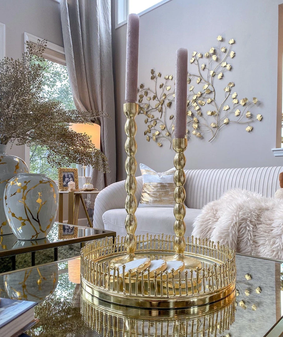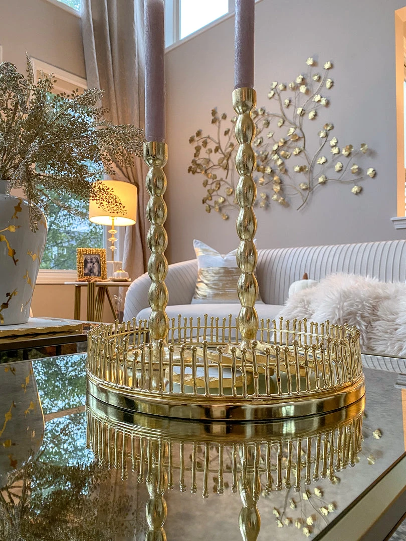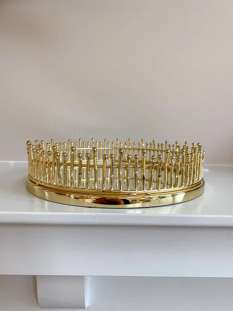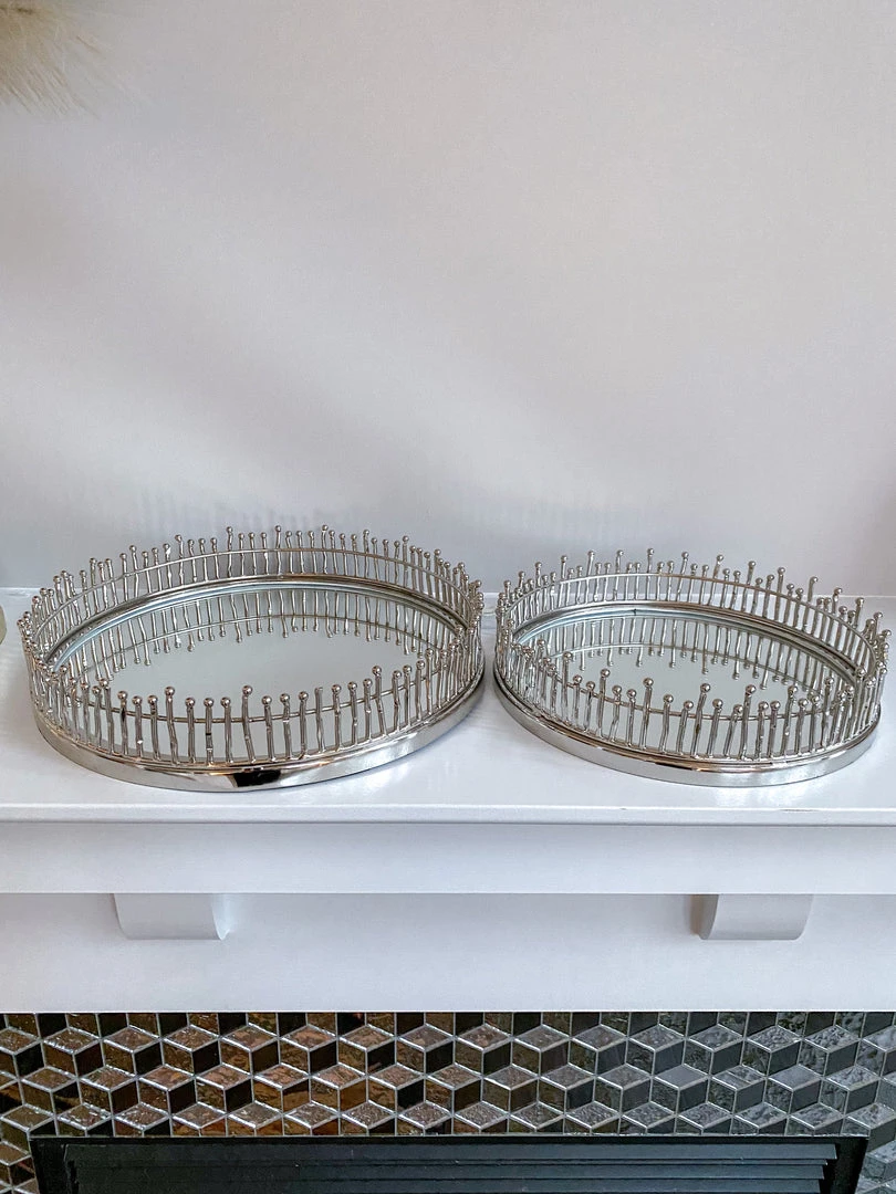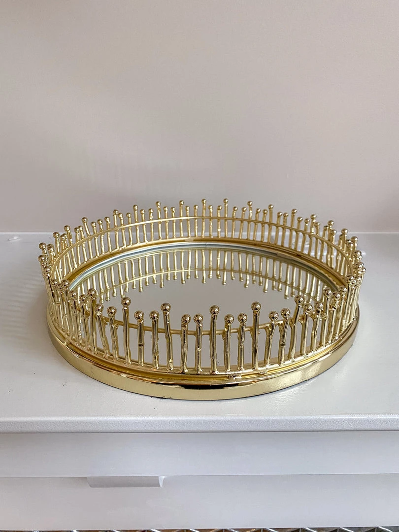 Description: This stunning round mirror tray offers a unique elegant fence detail. The straight design of the metal border featured stunning textures and details! Available in two sizes, and in gold or silver!