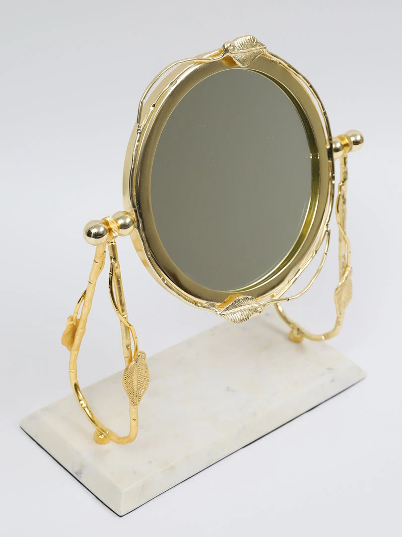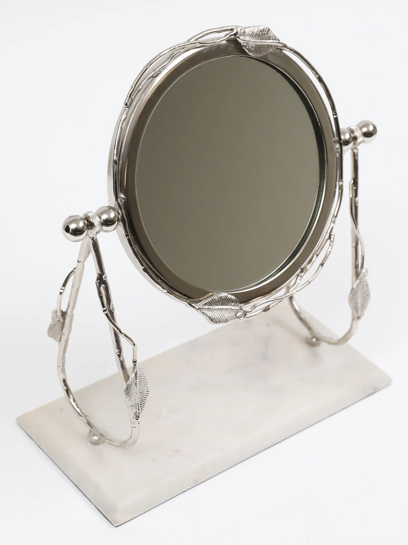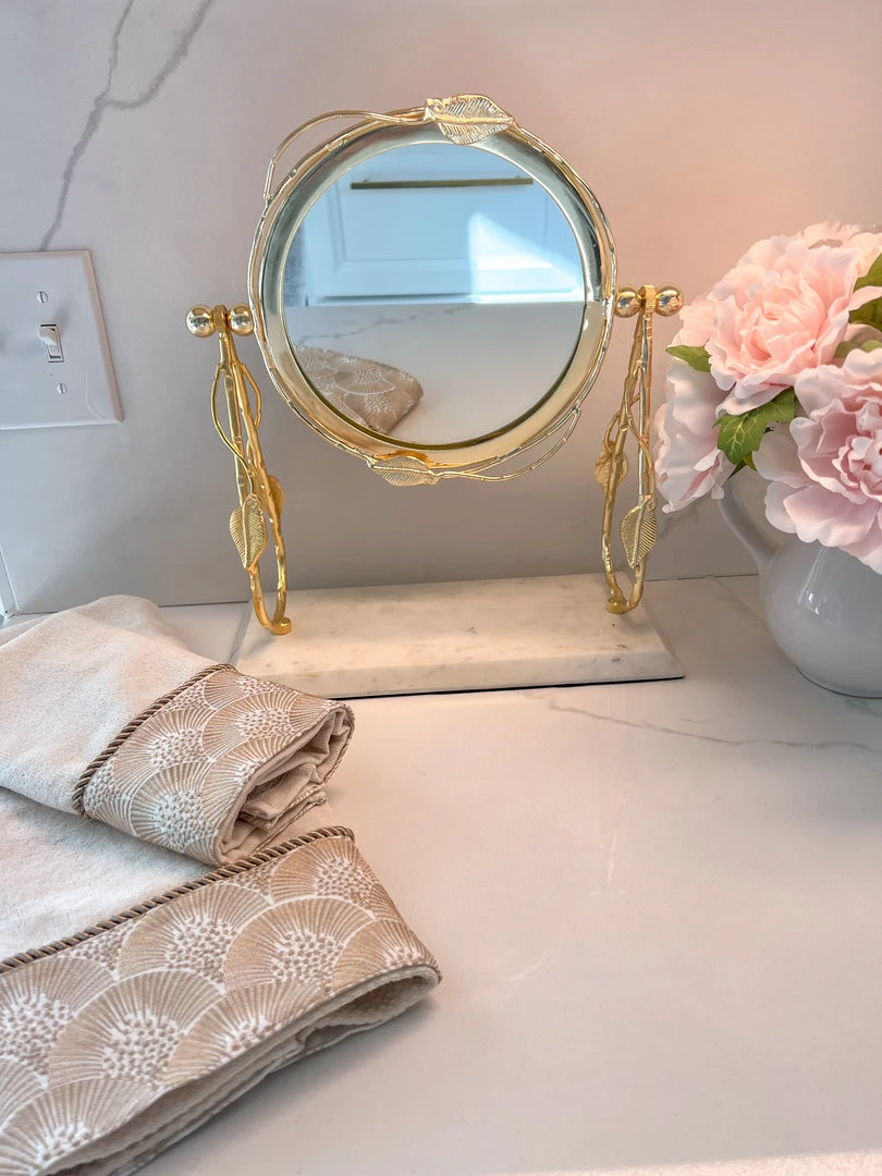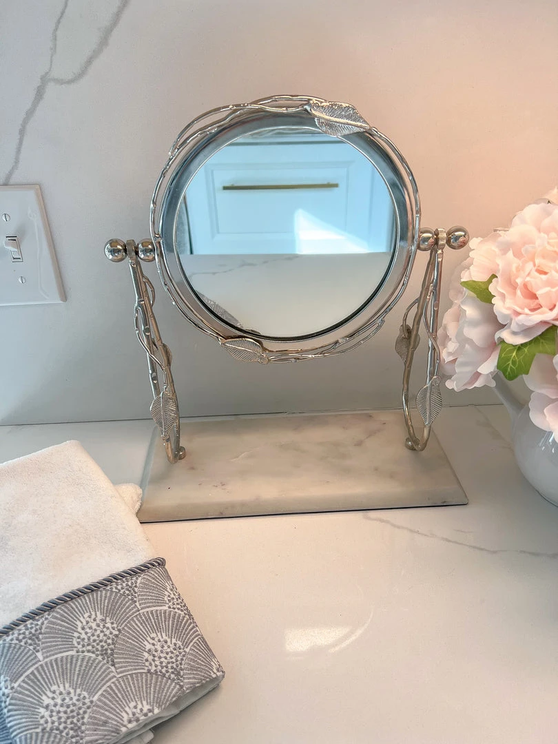 Description: This round vanity mirror has a white marble base and will look great on your vanity or bathroom counter!