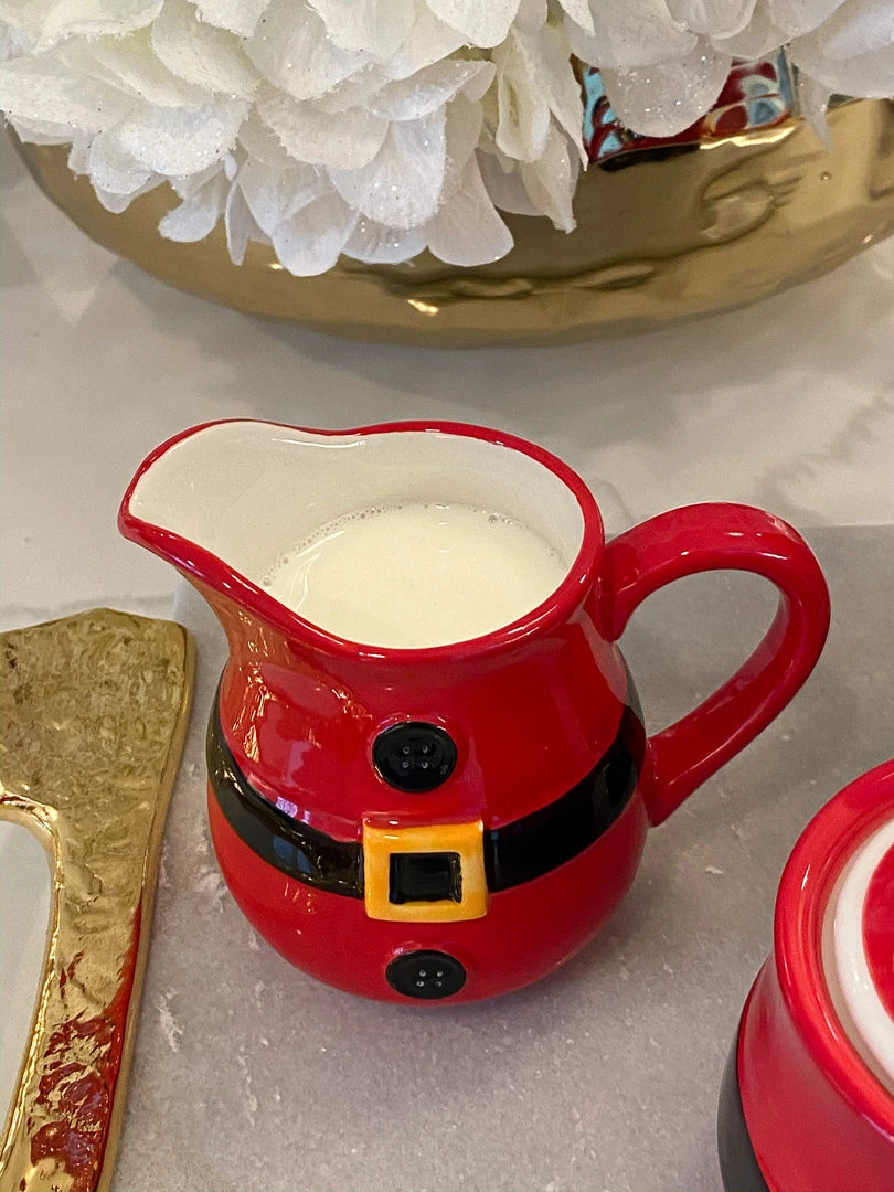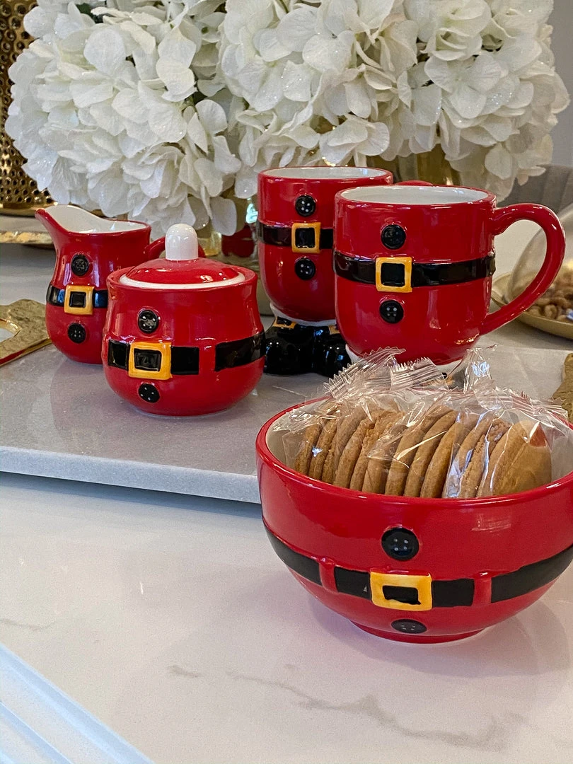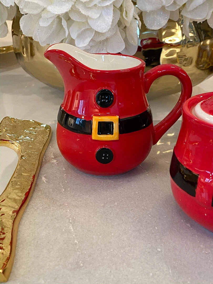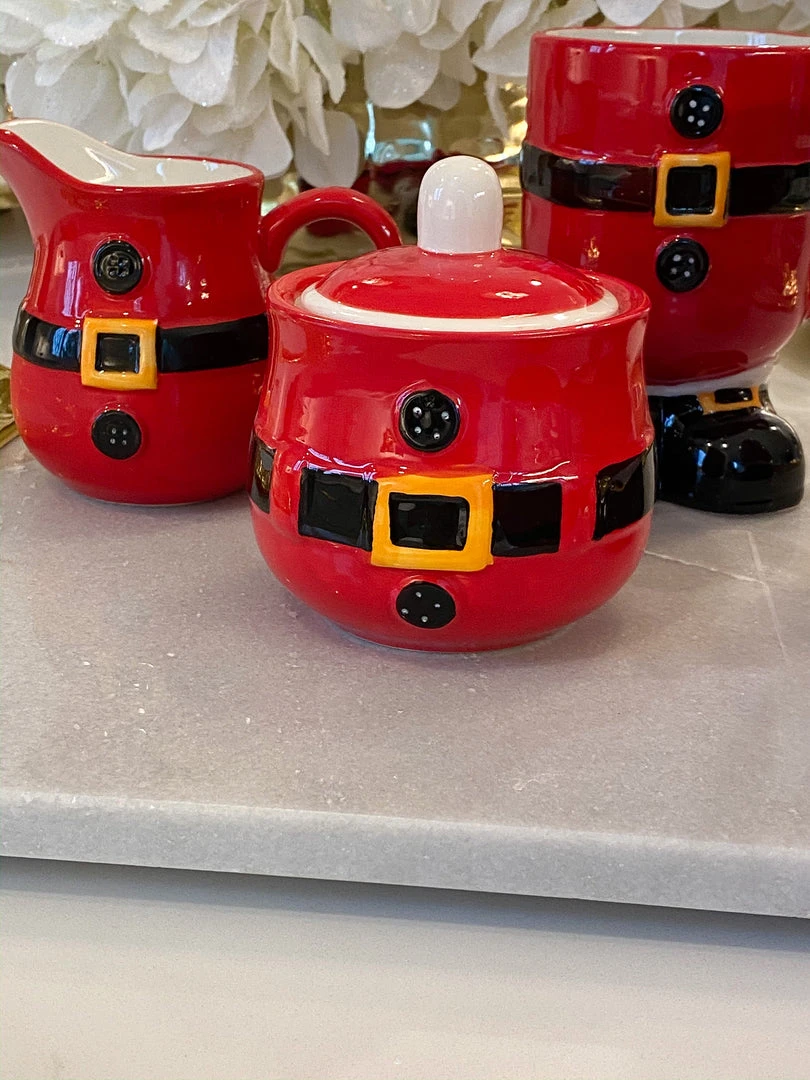 This Santa belt sugar and cream set are the cutest additon to your Holiday coffee station.