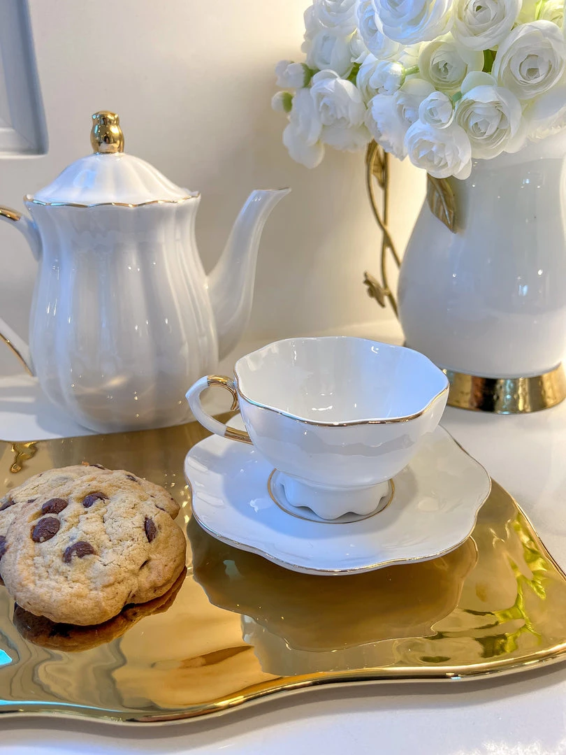 Description: Set of two, this is a beautiful fluted edge saucer with a white ribbed cup with gold details and is sure to make tea time that more enjoyable. The set includes 2 cups and 2 saucers.