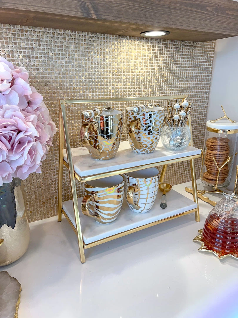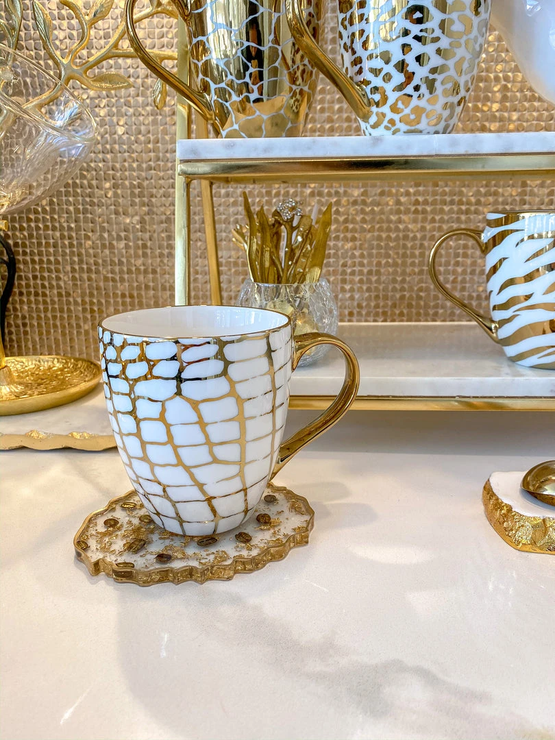 Description: These gorgeous gold coffee mugs offer a fun and stylish way to drink your coffee! This set of 4 mugs features gold leopard, zebra, snakeskin, and giraffe print mugs and is a fun and glamorous design!