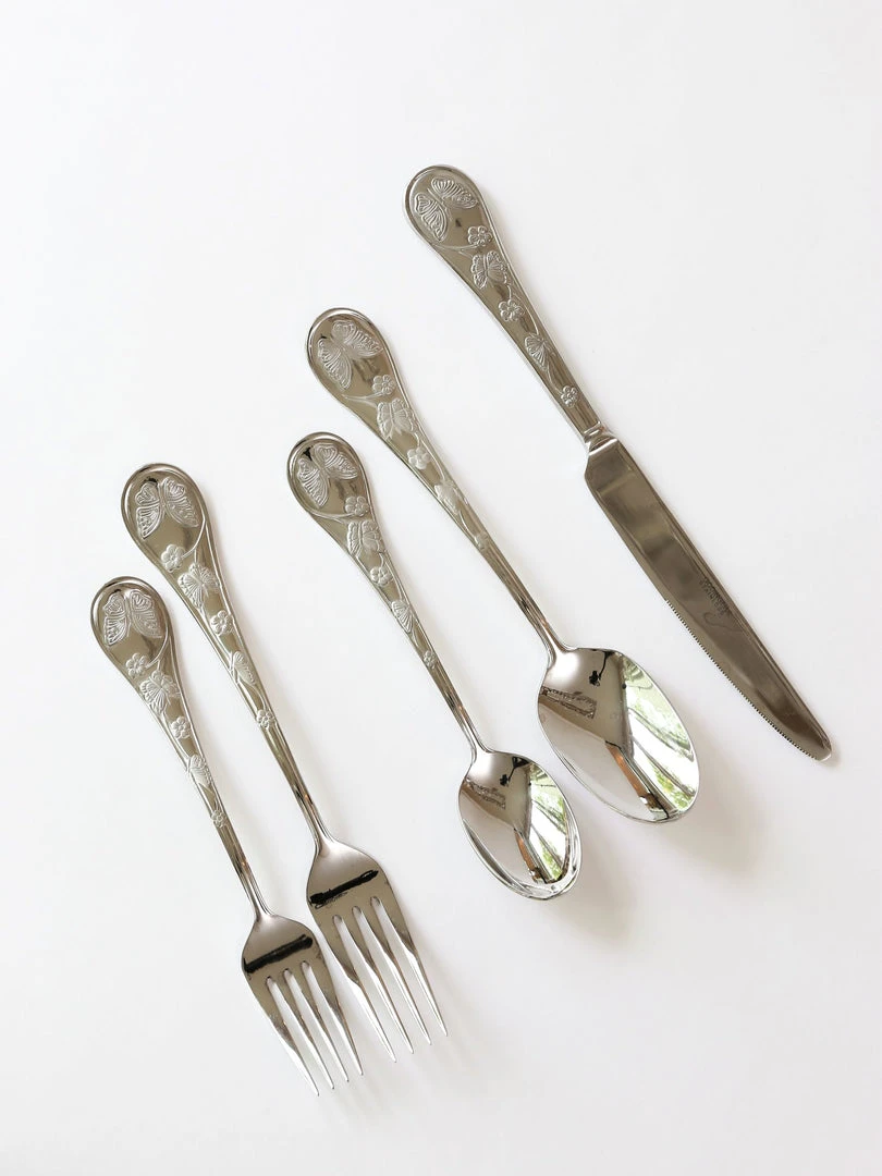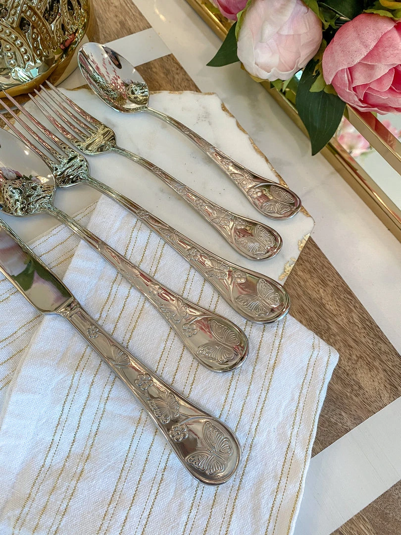 Description: Your dining display just got classier! This beautiful set of silver toned flatware is a beautiful and elegant way to serve your favorite meals! This set features a silver finish with butterfly details! Each set comes with a butter knife, dinner spoon, dessert spoon, dinner fork, and dessert fork.