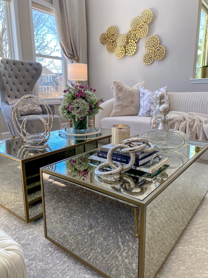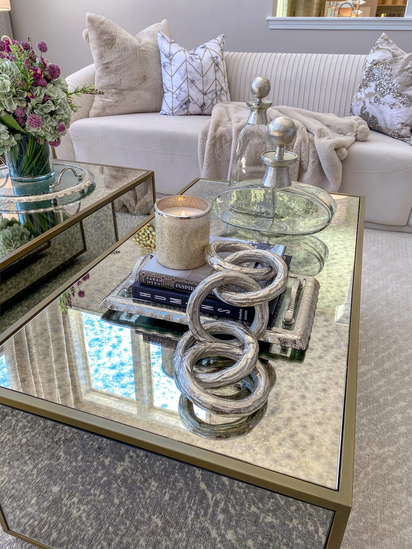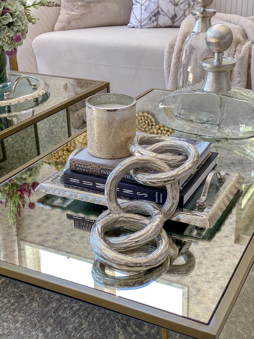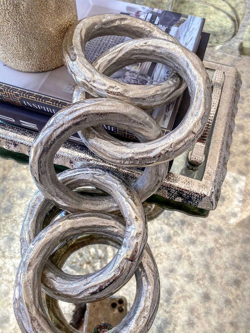 Description: This SIlver metal chain is quite substanital and adds texture and length to your decor. Perfect for any bookshelf or coffee table for our silver lovers!