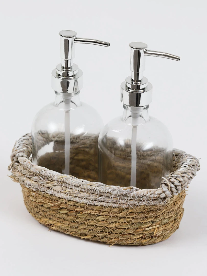 Description: This beautiful soap dispenser set is perfect for your bathroom or kitchen decor! Each set comes with 2 glass soap dispensers and a cute storage basket!