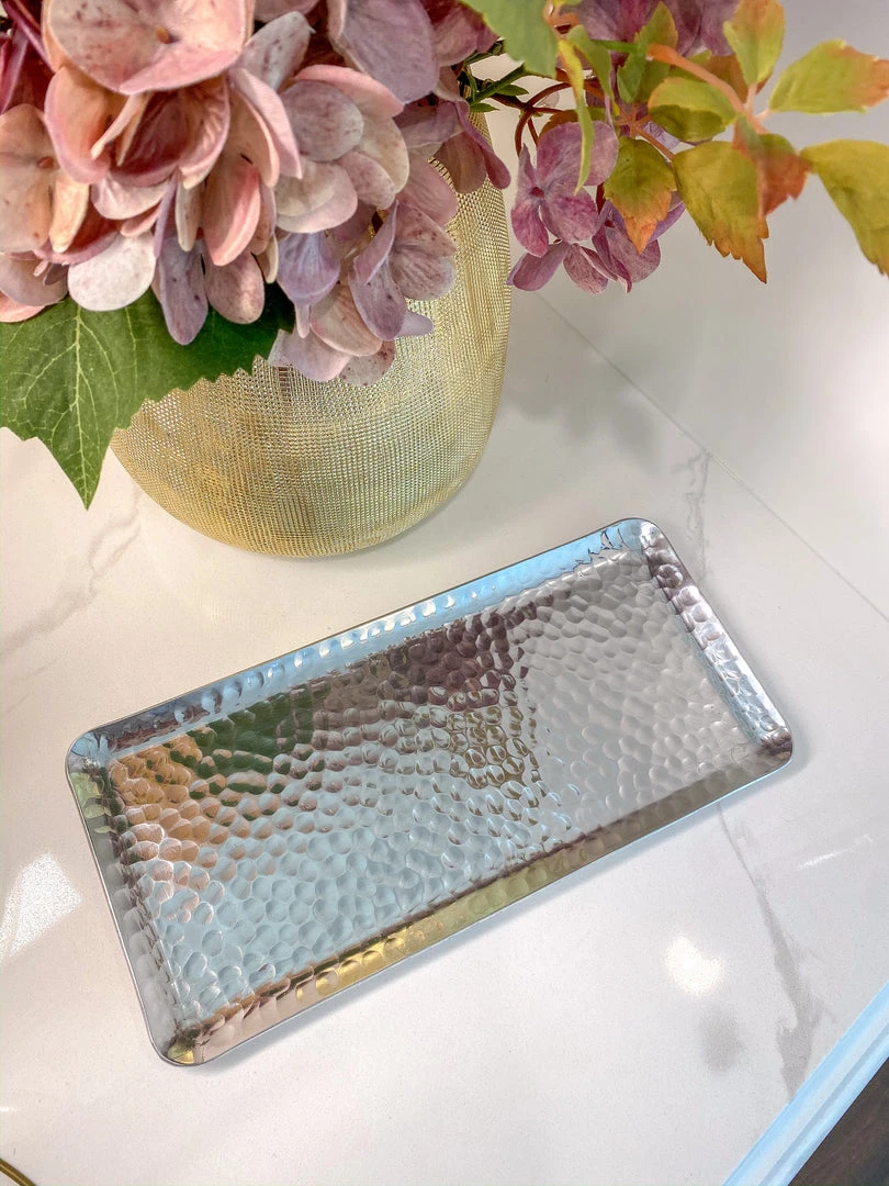 Description: This silver metal tray is the perefect size for dispalying any of our coasters or candles!