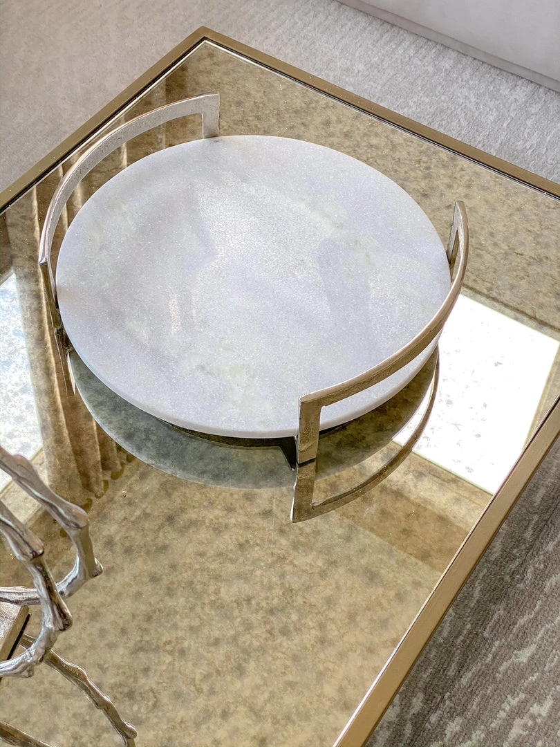 This awesome marble and metal tray features sturdy metal handles with a modern transitional flare and a beautiful round marble slab to hold your favorite pieces.