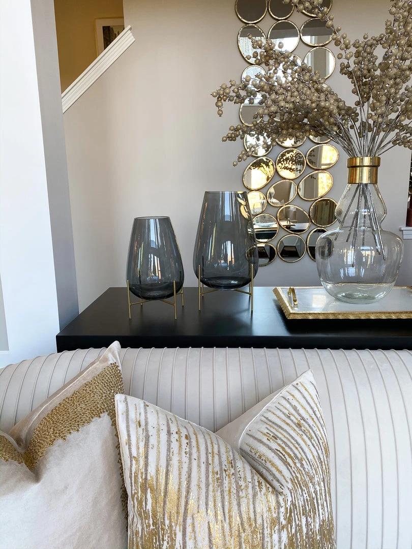 Description: These smoke colored vases sit on gold stands and can be filled with faux florals, or can be used and planters for a fun and mondern look! Come in two different sizes sold separately.