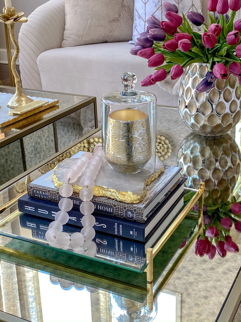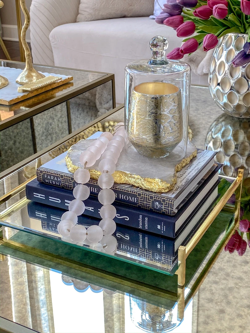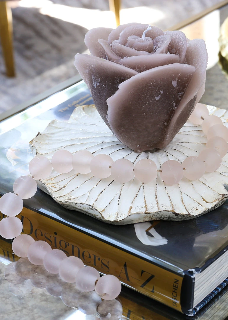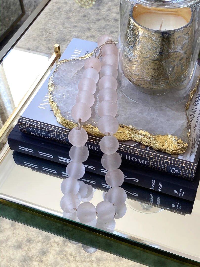 These lovely soft pink beads are constructed of glass and feature a matte finish. They are perfect to style on a tray with your favorite decorative coffee table books, or with a nice vase.