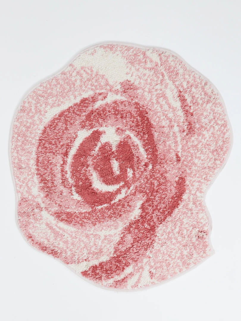 Beautiful bath accessories in hand-painted dimensional resin – the flowers almost come alive – on a textured off-white base. The shower curtain is printed with an oversized floral pattern with the leaves cascading toward the bottom on white background. The rug is tufted in 100% cotton in the shape of a rose in various shades of pink and white and everything coordinates perfectly with the bath, hand, and fingertip embroidered decorative towels.