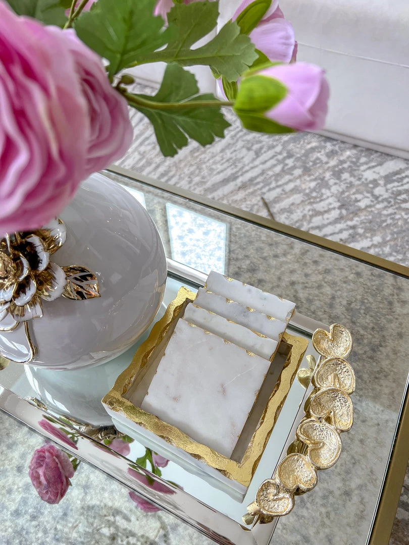 Description: These square marble coasters are perfection! They feature a metallic gold foiled border. Perfect to style on a coffee or side table with a tray or on their own!