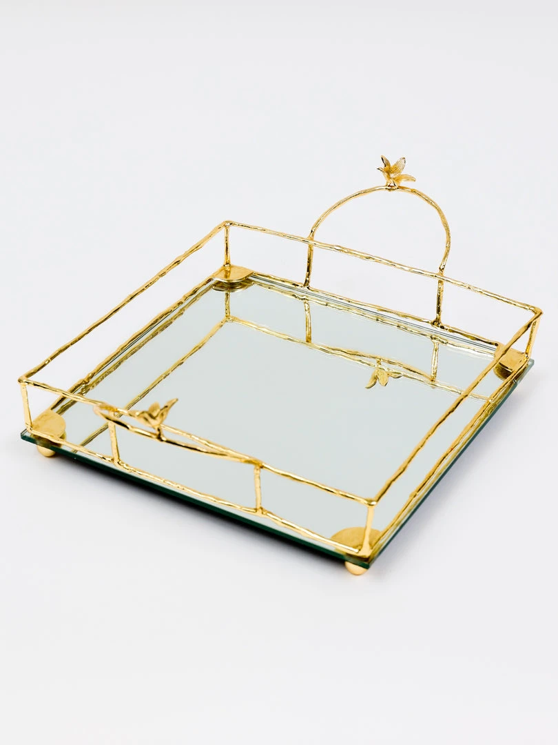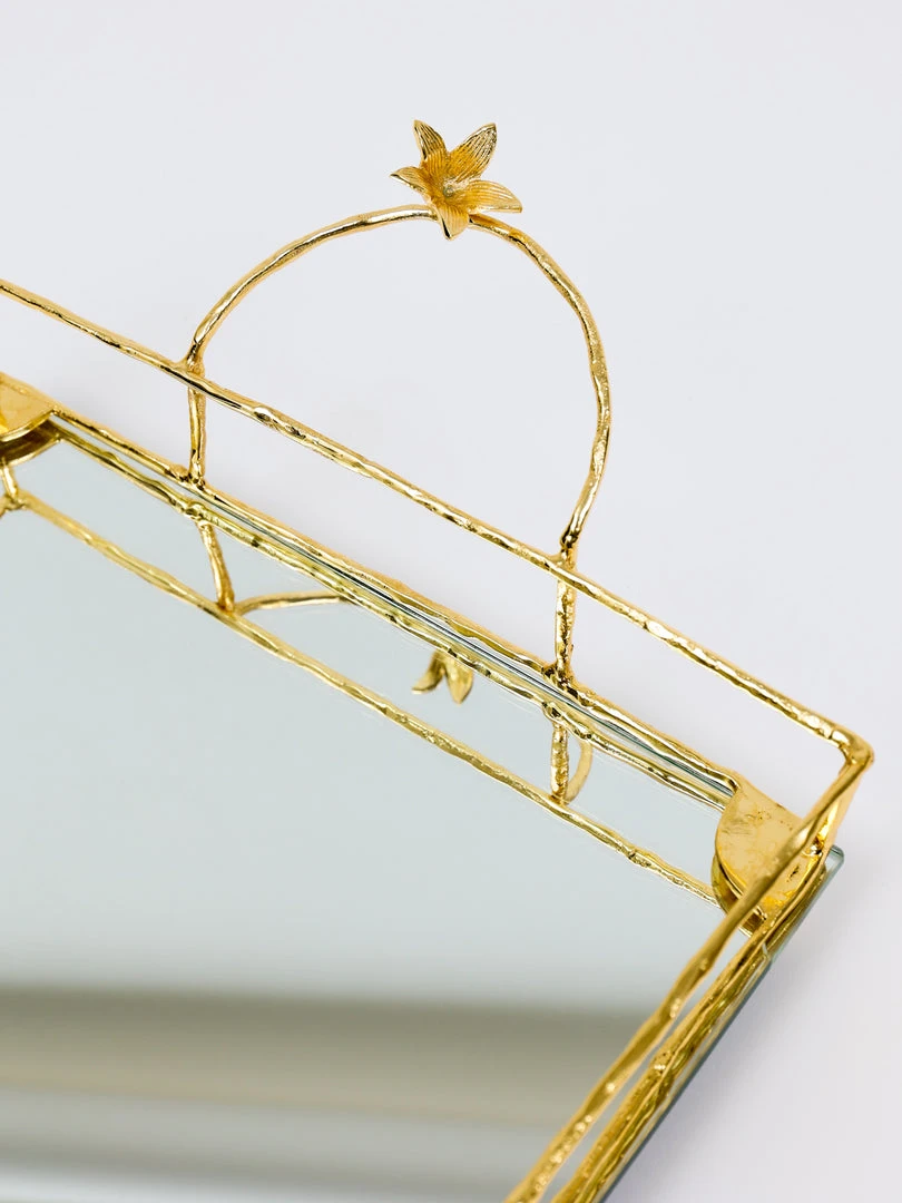 Description: This is a gorgeous square mirrored tray with stunning gold flower details which can be used on a vanity or for layering on your coffee table.Â