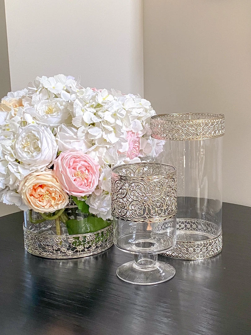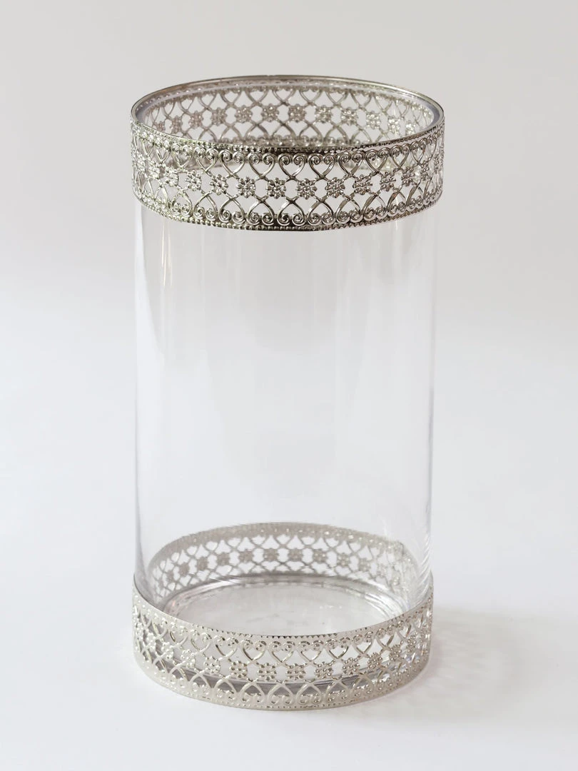 Description: This beautiful glass tall vase features a stunning detail. An ornate silver metal rim accents the piece and elevates the entire design.