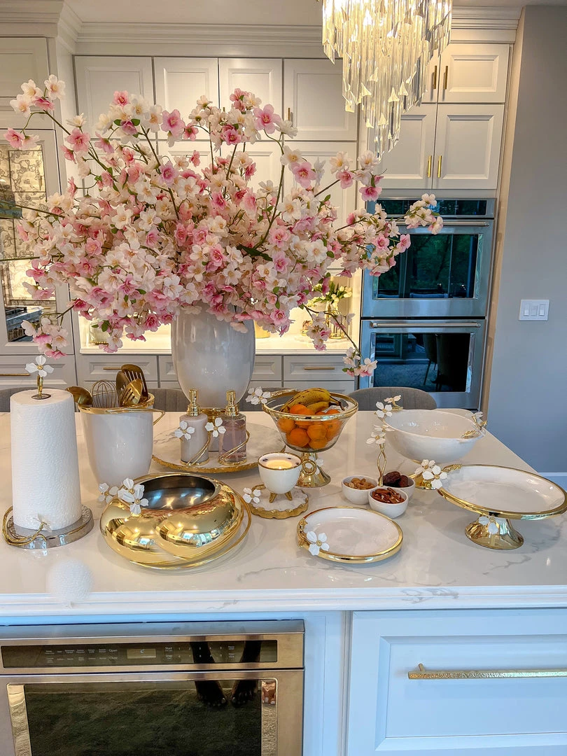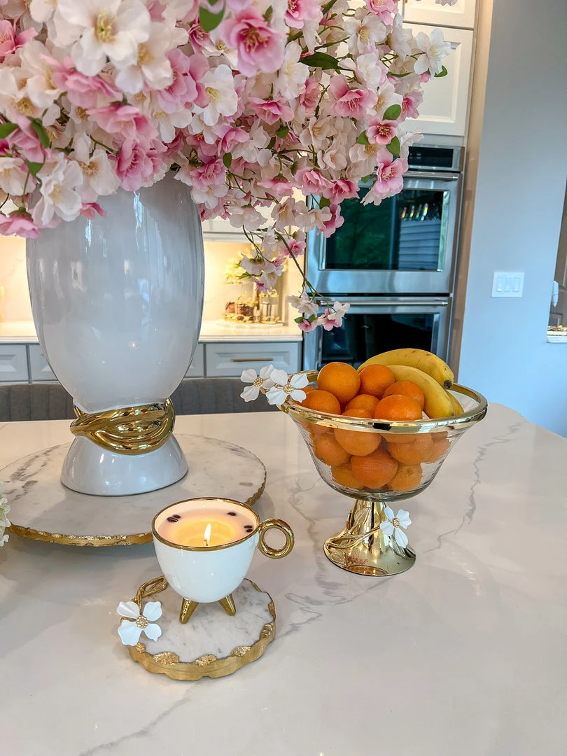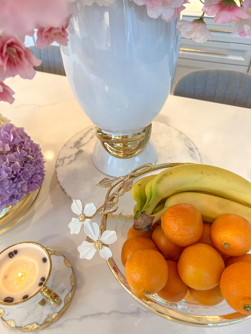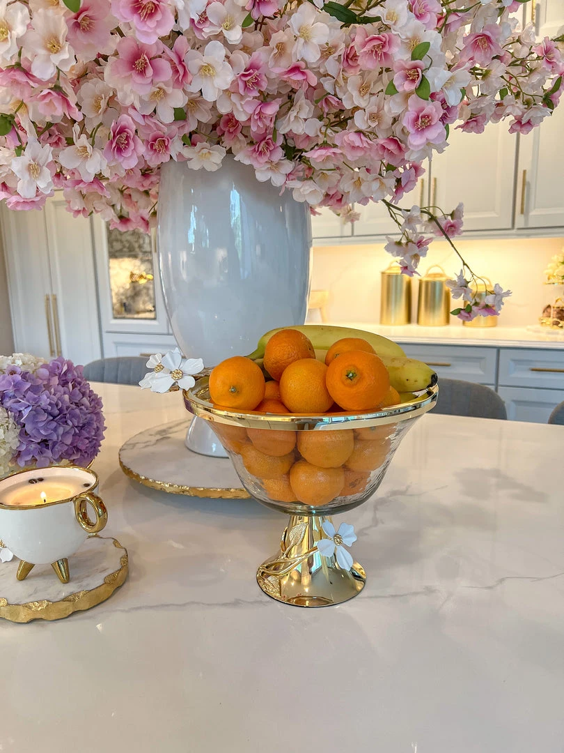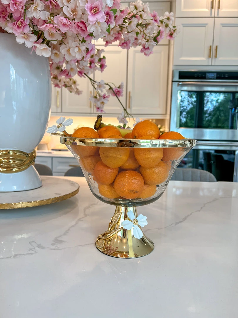 Description: This gorgeous bowl will become your favorite fruit bowl or use it to display your favorite florals. The gorgeous white jeweled flower details ties back to the entire collection.