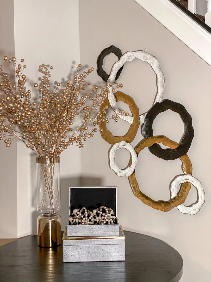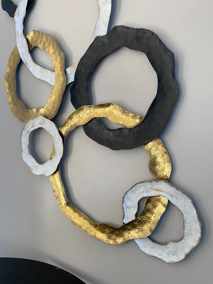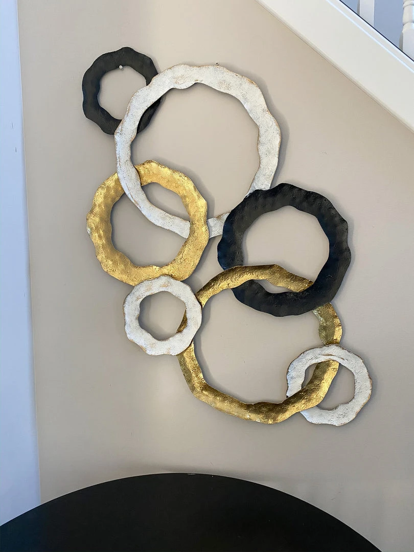 This metal wall art with black, white and gold circles is a perfect statement piece for any wall in any room!