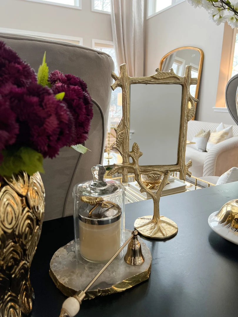 Description: This gold branch framed mirror is so unique! Perfect for a side table or credenza.