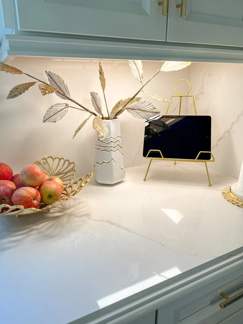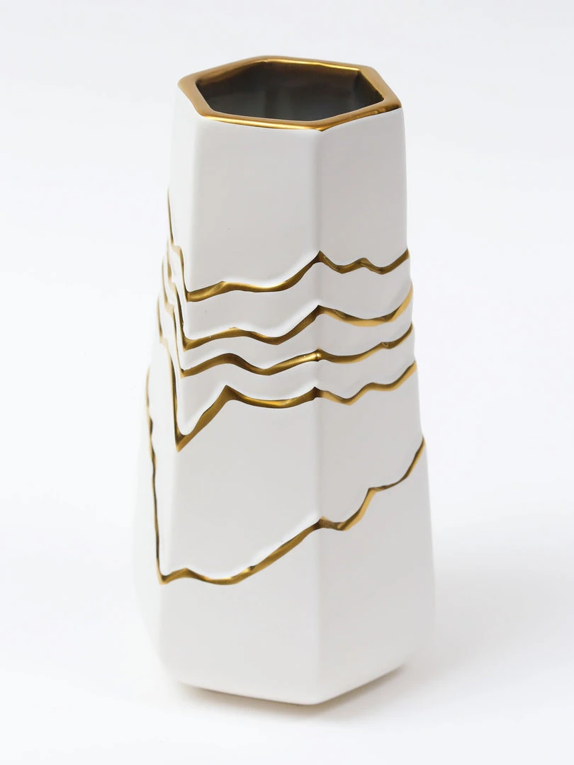 Description: We are loving this white and gold striped vase! It provides and clean and elegant look to your home! Perfect height for all your faux florals.