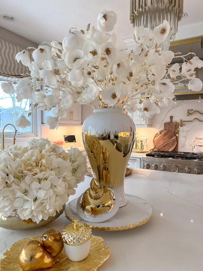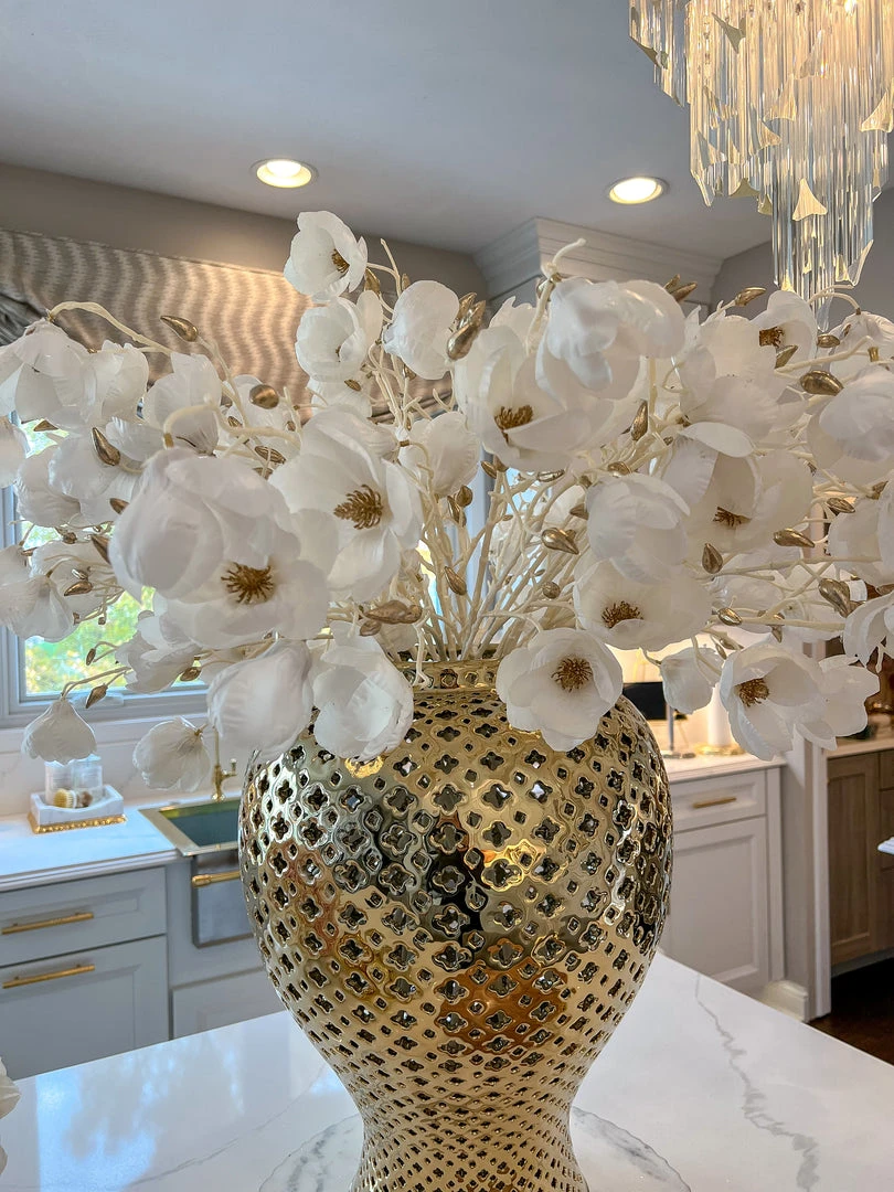 Description: This stunning white and gold stem resembles a beautiful porcelain magnolia flower. It is the perfect stem to use during the winter months, but can be styled year round!