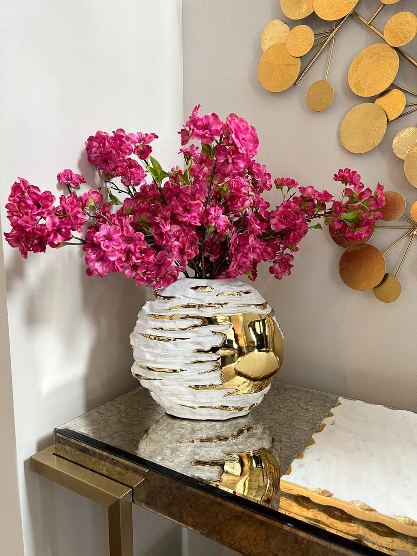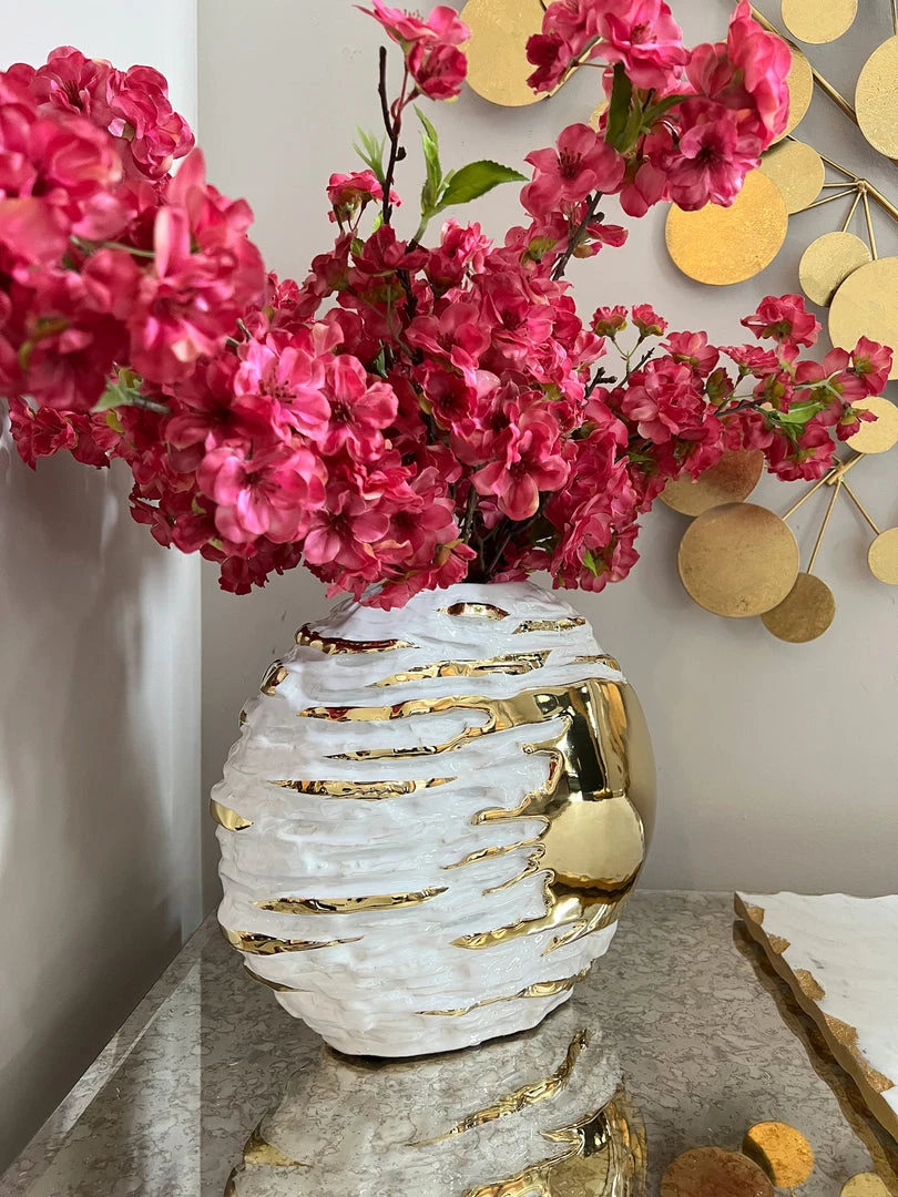 Description: This white and gold textured vase will bring some interest to any vingette! It ties back beautifully to our white and gold textured bowl if you want a matching pair!