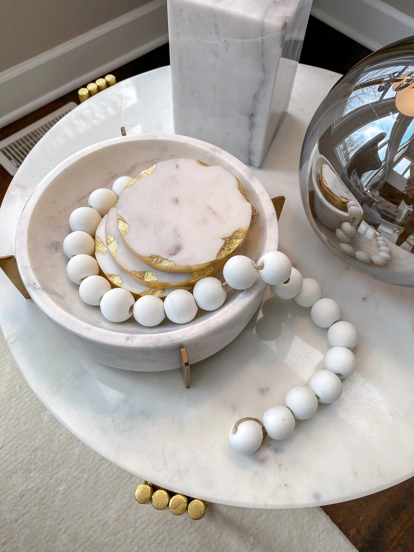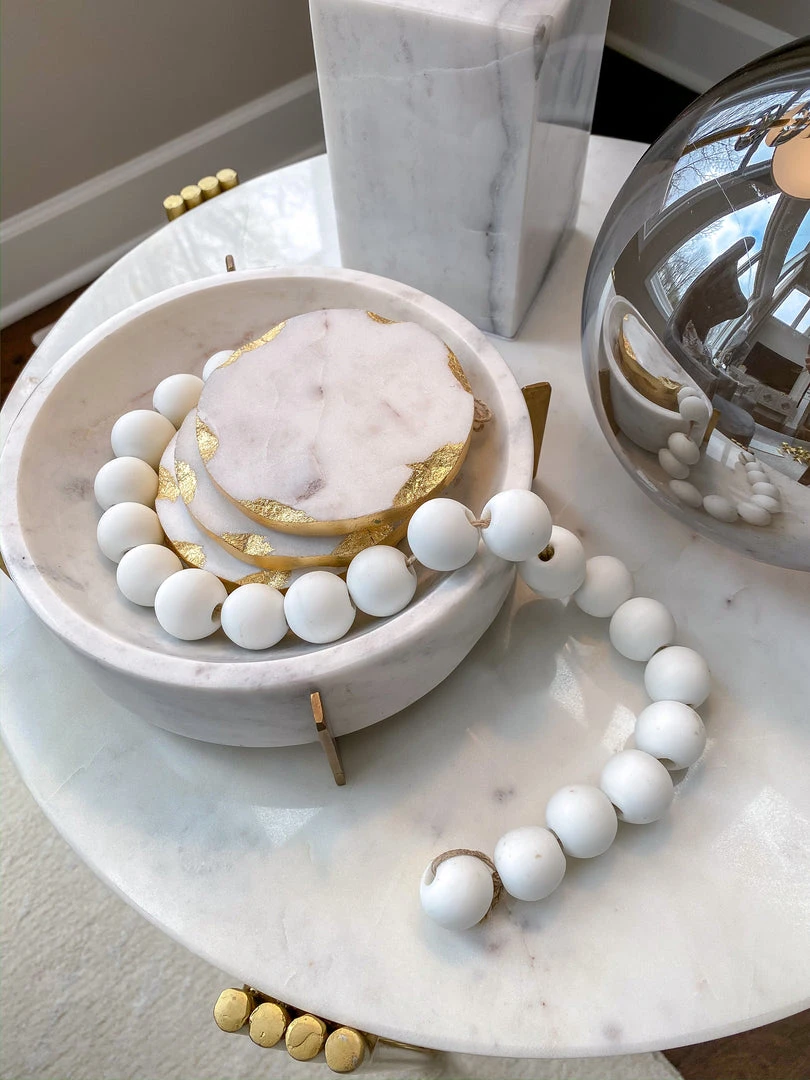 These lovely white beads are constructed of glass and feature a matte finish. They are perfect to style on a tray with your favorite decorative coffee table books, or with a nice vase.