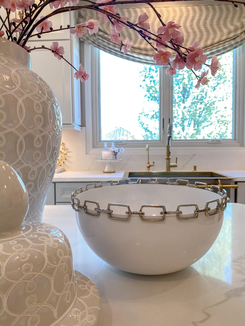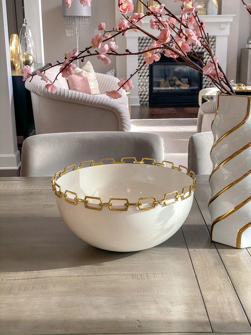 Description: This stylish bowl features a white base and chain rim detail is perfect to display your favorite fillers. Decorative use only.