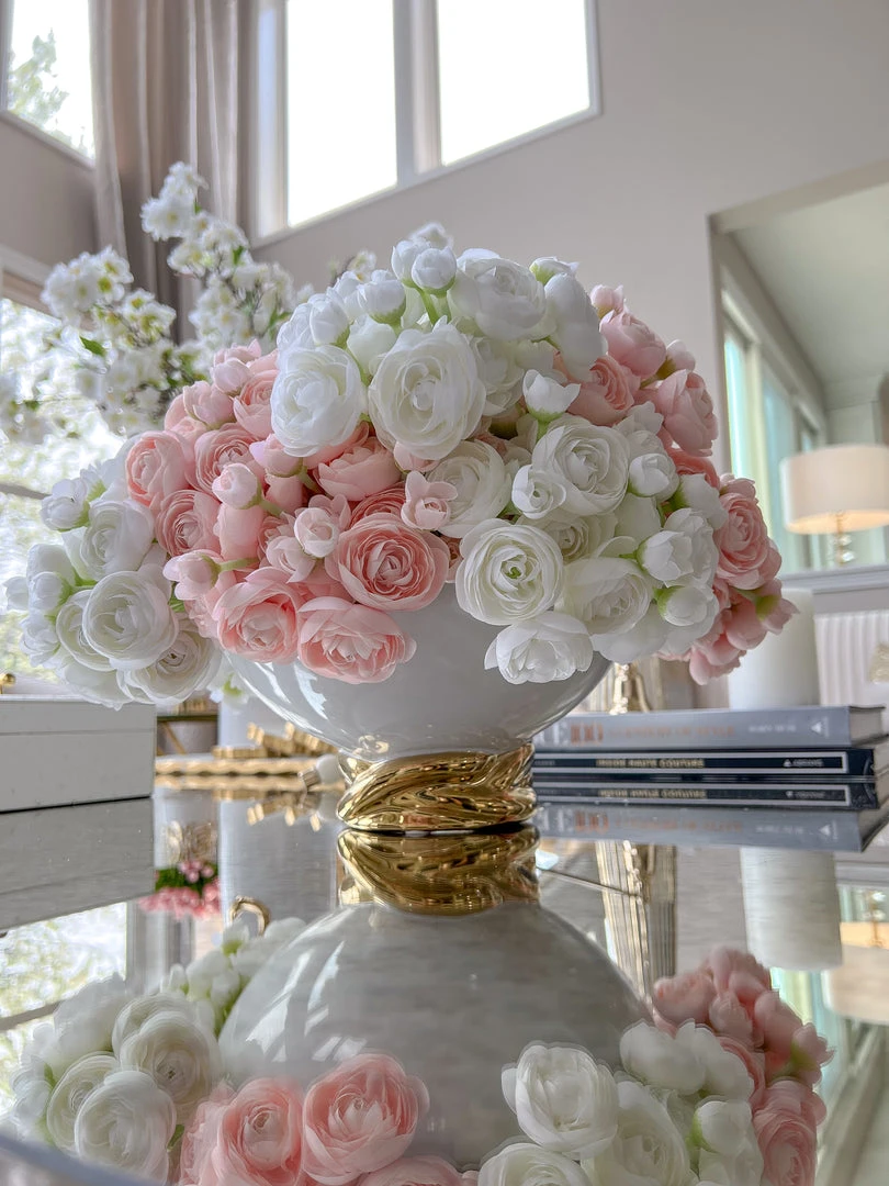 Description: This is a gorgeous small bowl has an elegant gold braided design base that matches back to our white vases with elegant gold details.