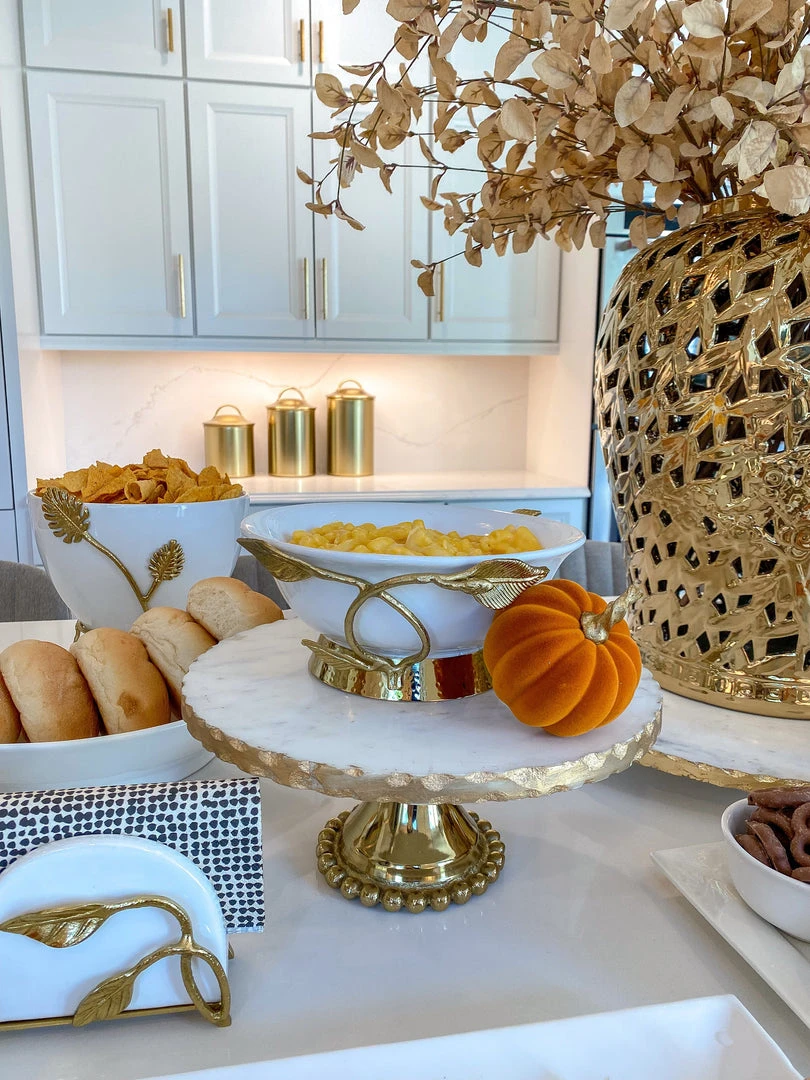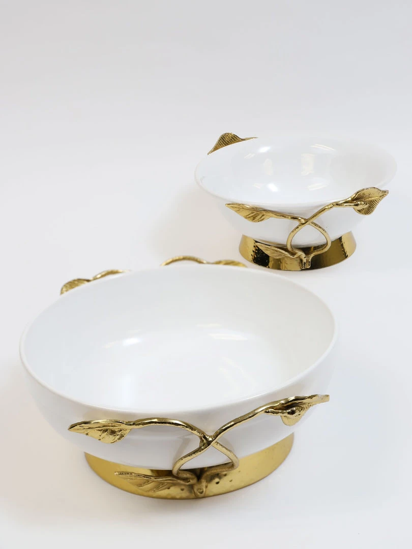 Description: This beautiful bowl is a great piece of elegant design. The gold leaves complement the glossy white ceramic to create a timeless look of sheer elegance and glam.