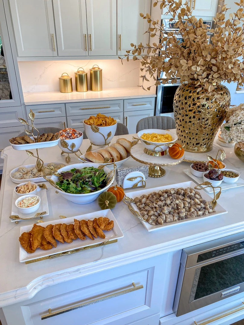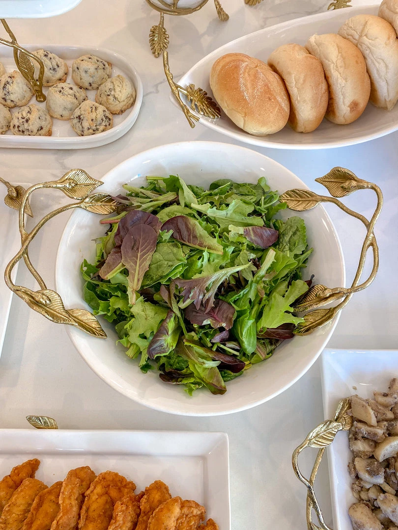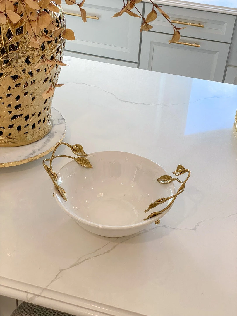 Description: This beautiful bowl is a great piece of elegant design. The gold leaves compliment the glossy white ceramic to create a timeless look of sheer elegance and glam.