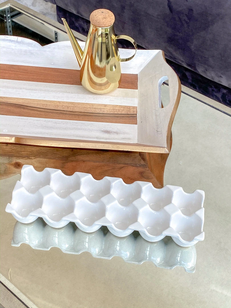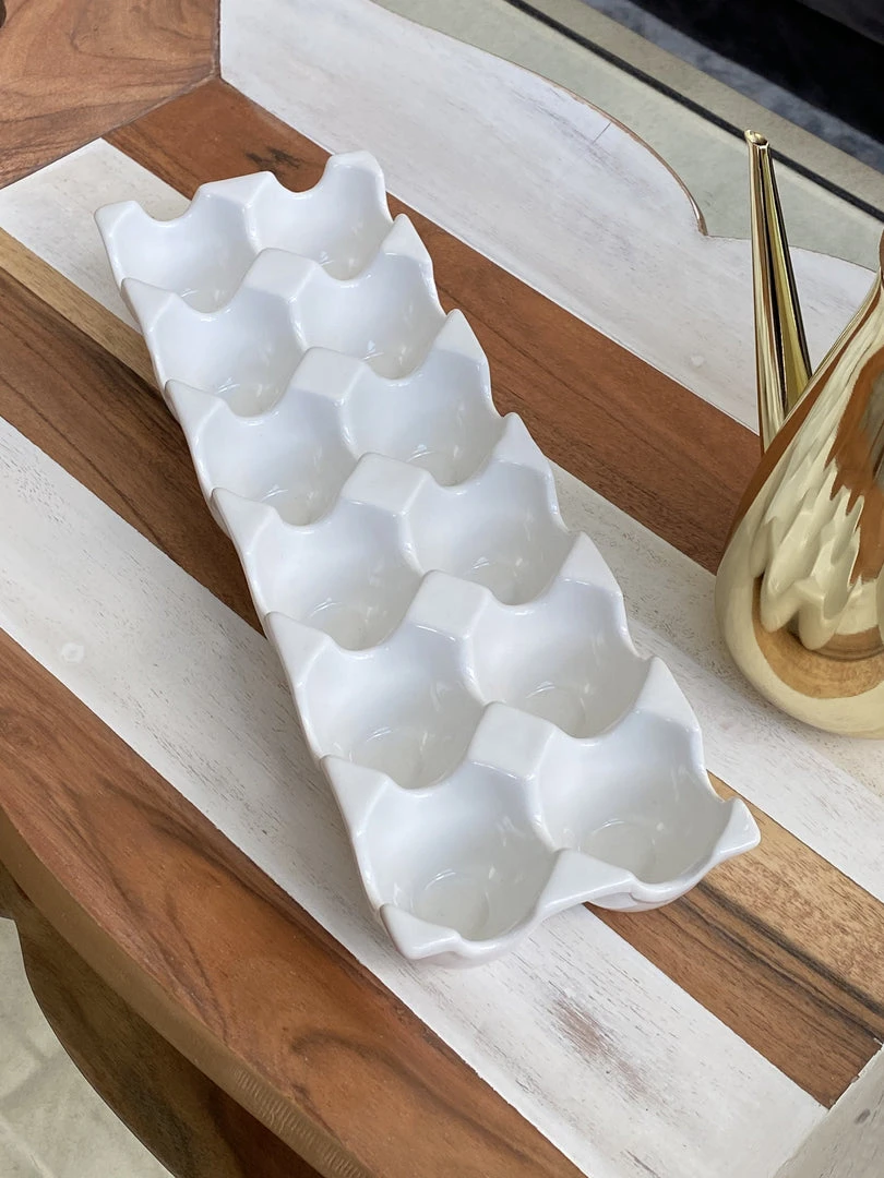 This white ceramic egg tray allows for functional elegance when storing eggs inside of your refrigerator.