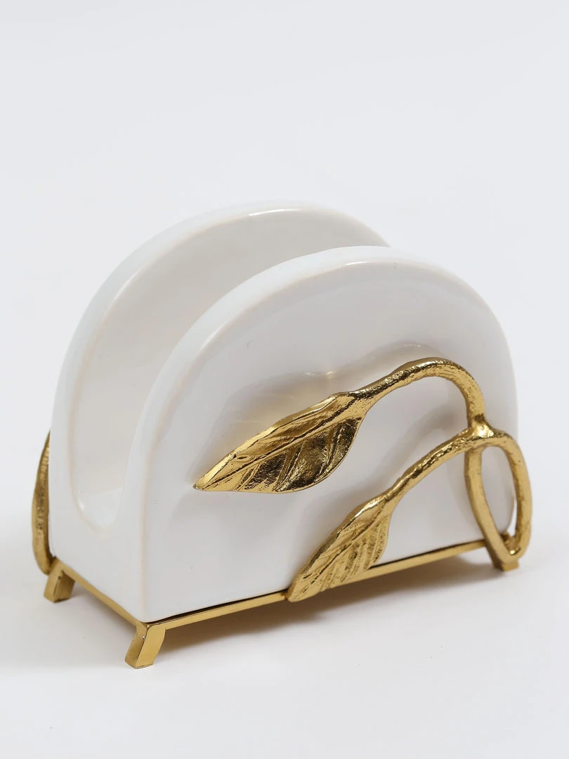Description: This beautiful napkin holder is a great piece of elegant design. The gold leaves compliment the glossy white ceramic to create a timeless look of sheer elegance and glam.