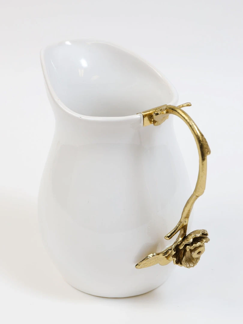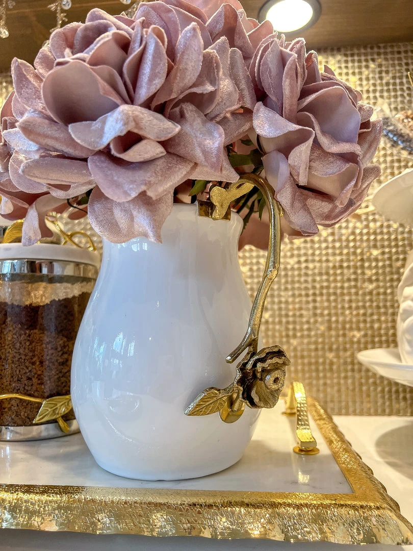 Description: This beautiful white vase with its delicate rose handle is a simple yet elegant design.
