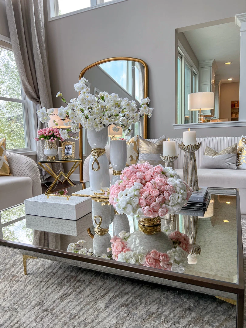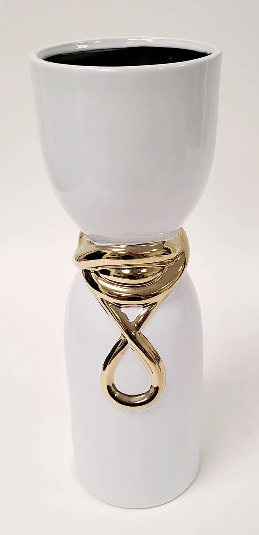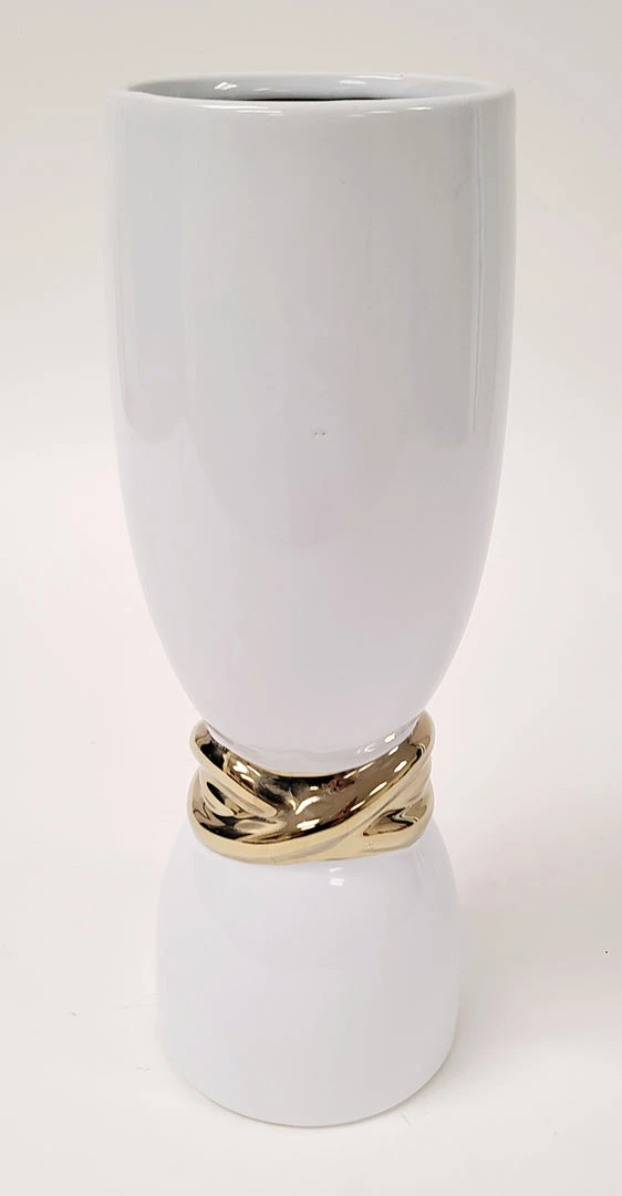 Description: This white and gold vase has a beautiful and unique style! You can style it on its own or on top of a tray with your favorite faux floral. The tall vase has a beautiful cascading gold design and the short has an elegant detailed golden braid design. These match well with the white bowl with elegant gold design.