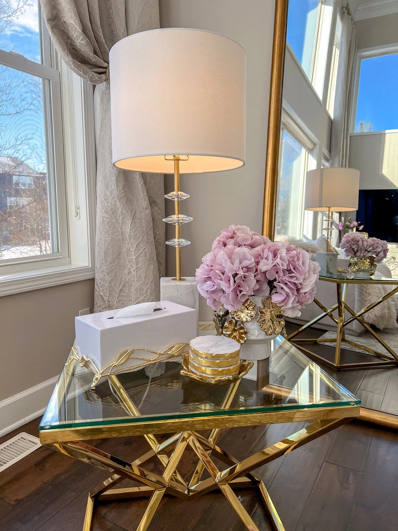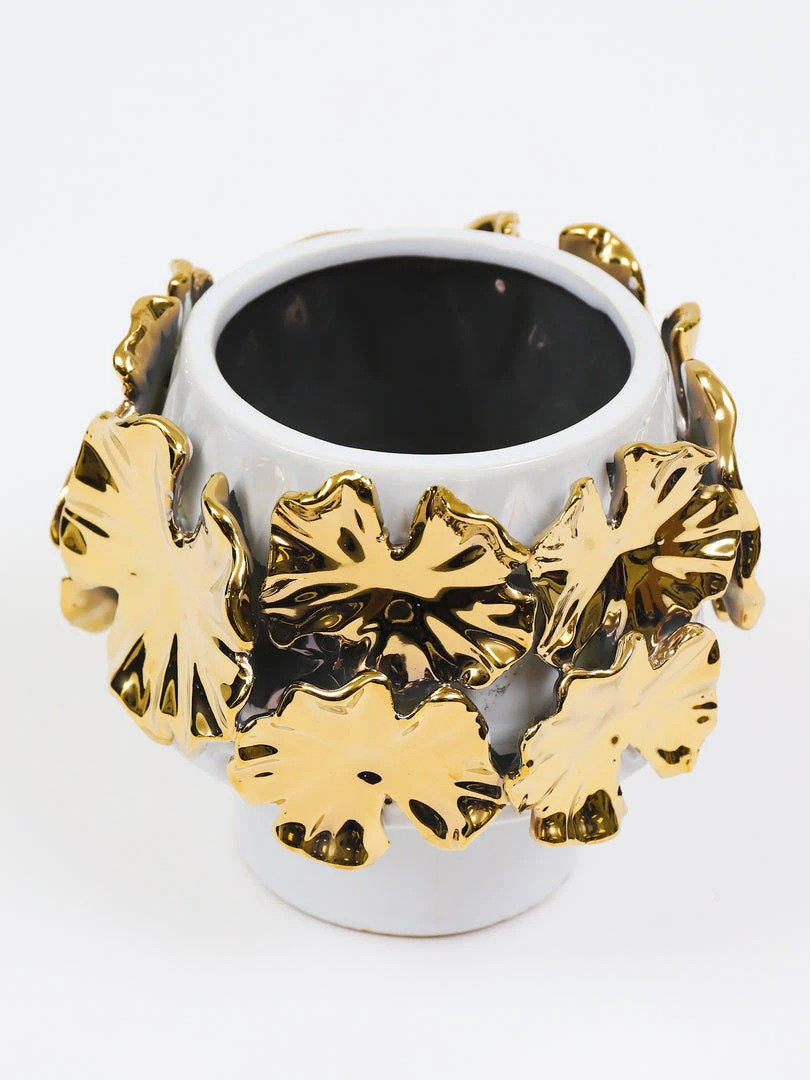 Description: This white vase features stunning gold floral details all around. Add your favorite faux florals and you will have a stunning piece to display.