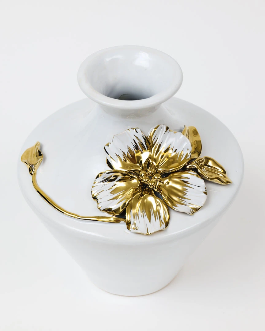Description:Â This is a must-have item! The white ceramic vase is enhanced by the bold 3D gold and white floral design!