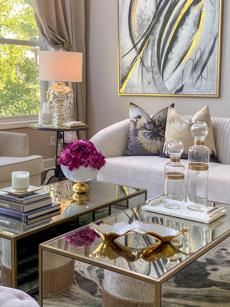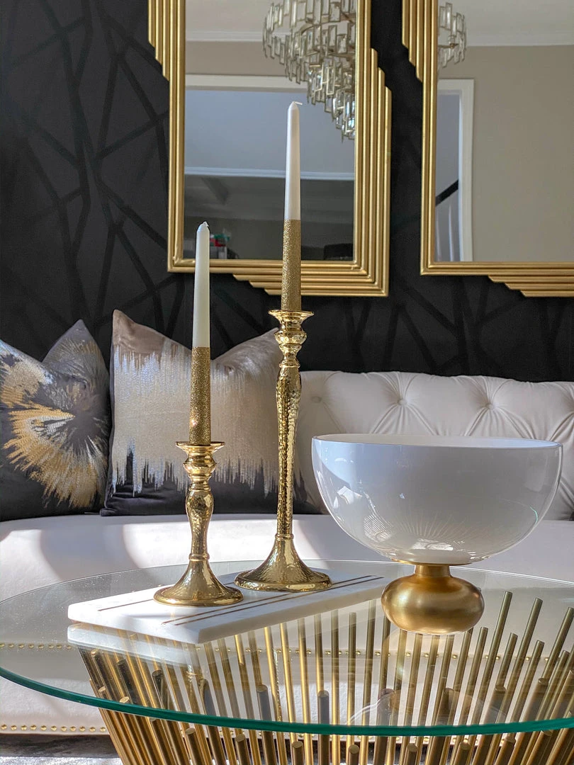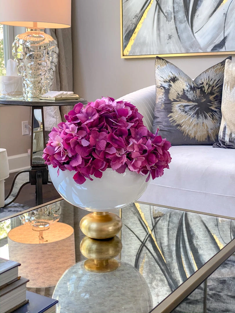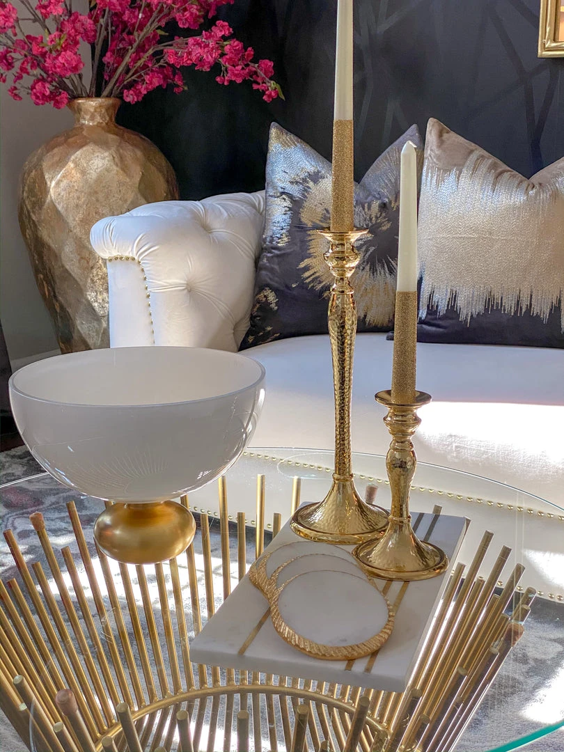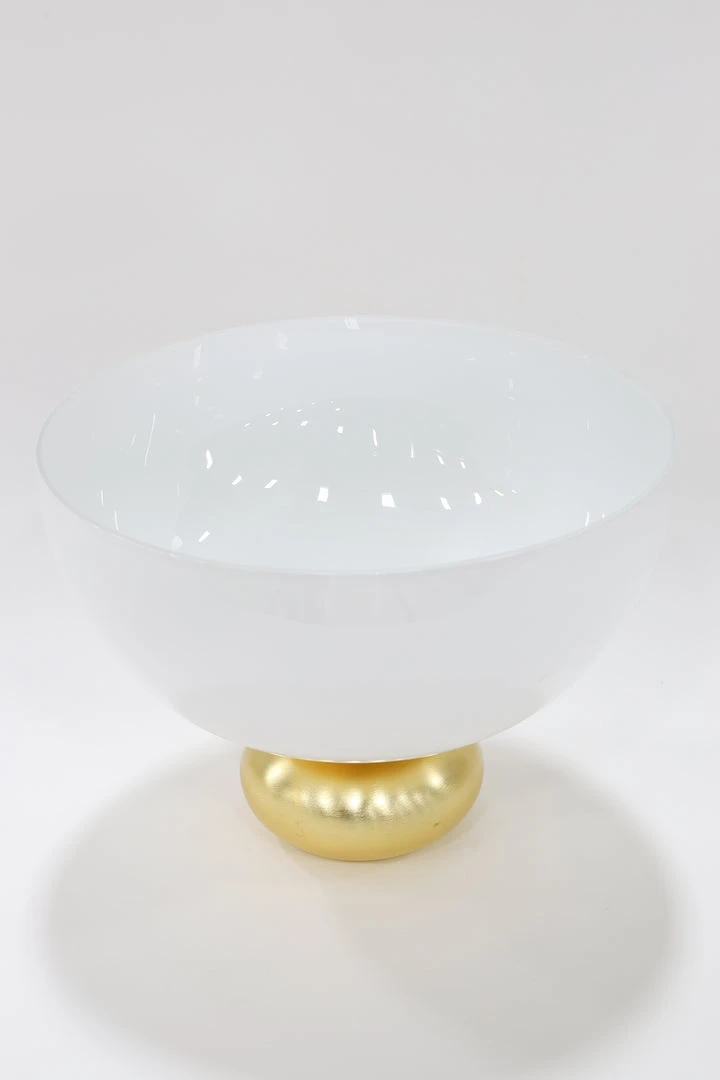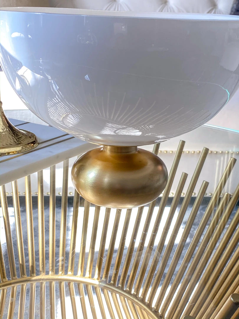 This white glass bowl features a rounded gold base and has a modern transitional feel to it! Loving the white and gold combo!