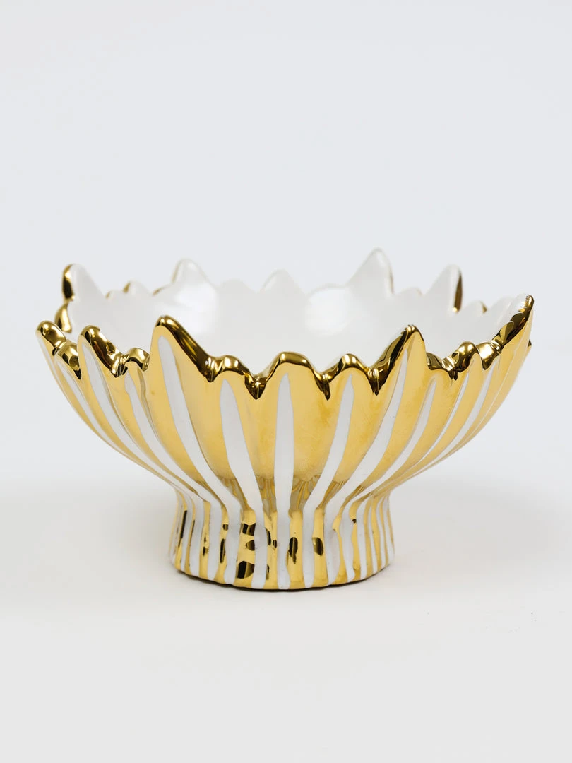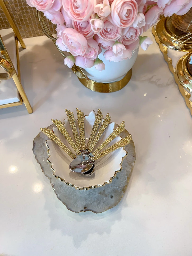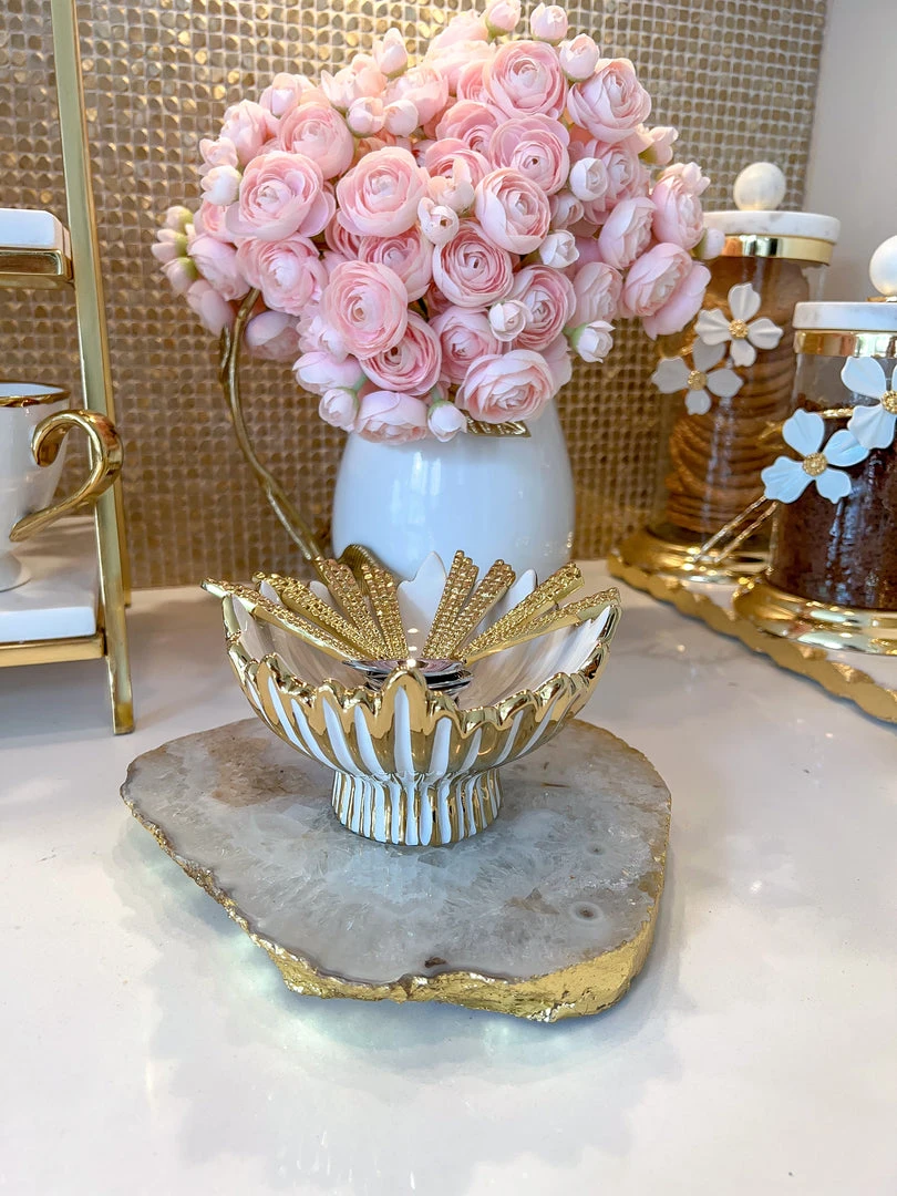 Description: This piece is perfect for holding your spoons or makes the perfect candle holder and will bring texture and glamour to your room! We love the white and gold combo!