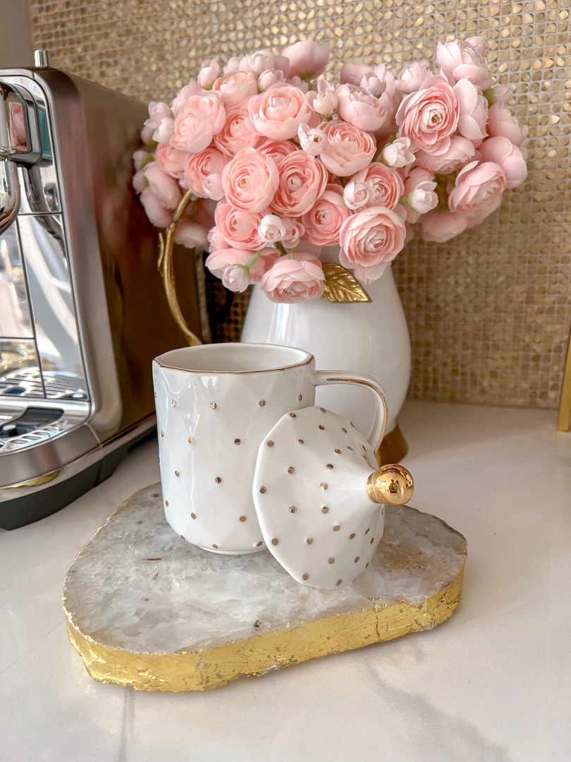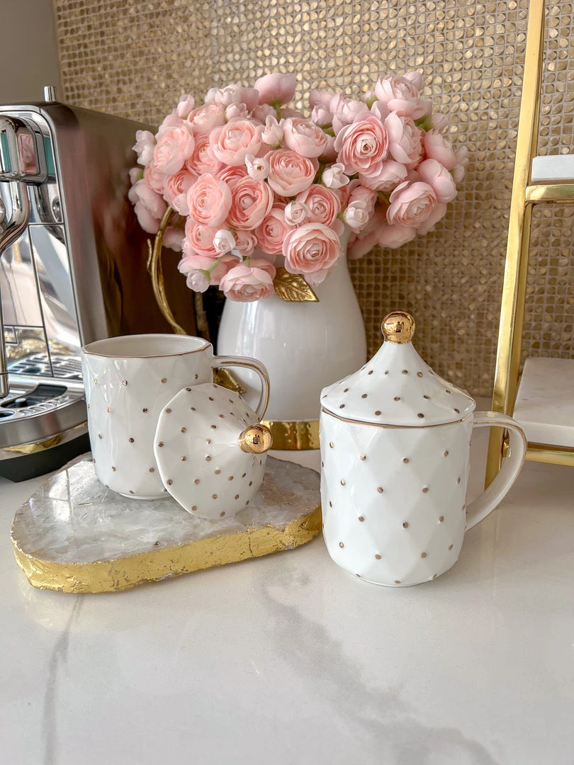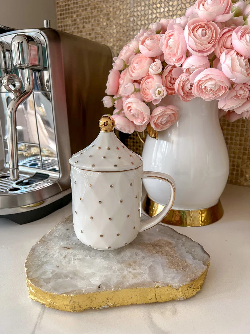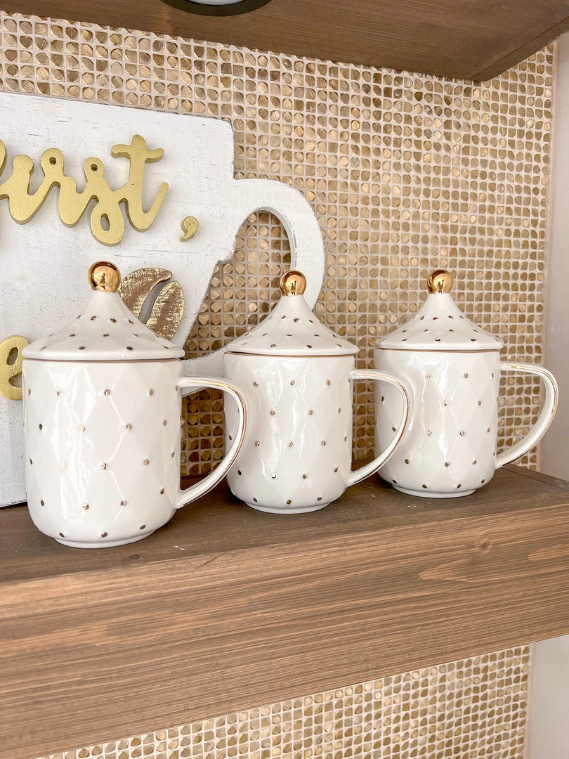 Description: This white and gold dotted mug with a matching lid has a timeless look and is sure to elevate your coffee station!