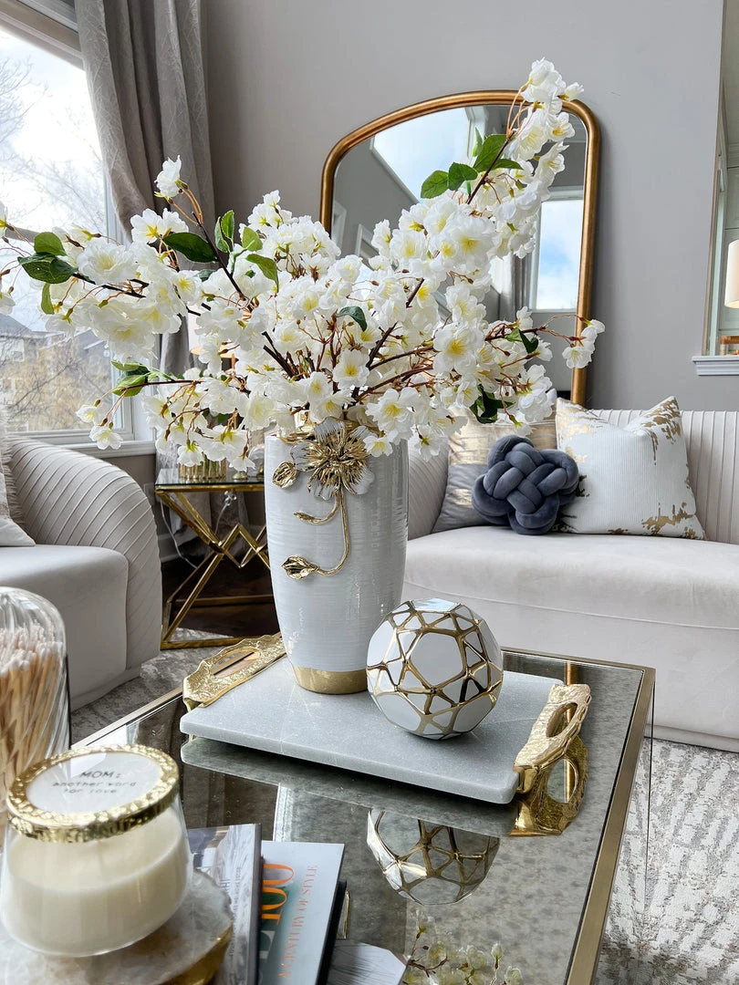 Description: This stunning vase features a gold and white intricate flower that is just stunning. We love the delicate details in the flower.