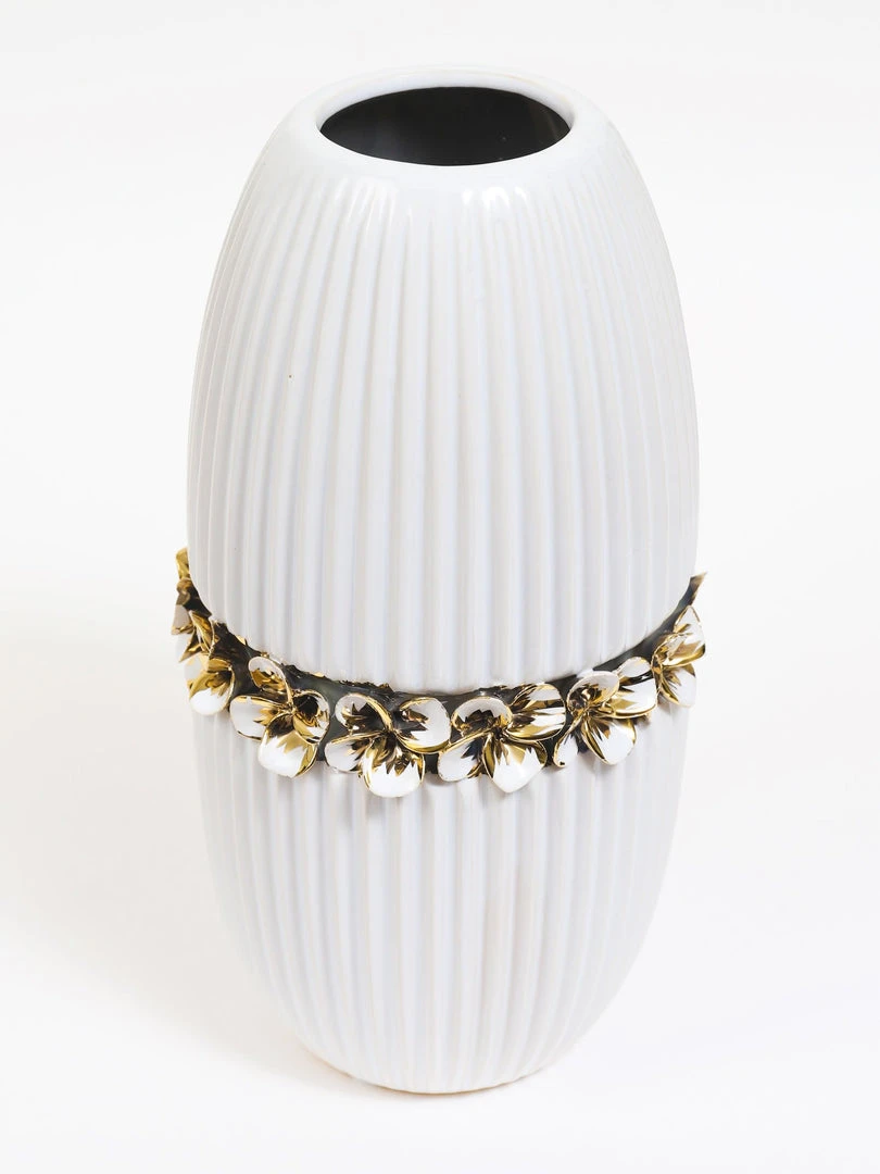 Description: This gorgeous textured ceramic vase features a delicate gold floral stripe through the middle and will make a statement anywhere you place it.Â