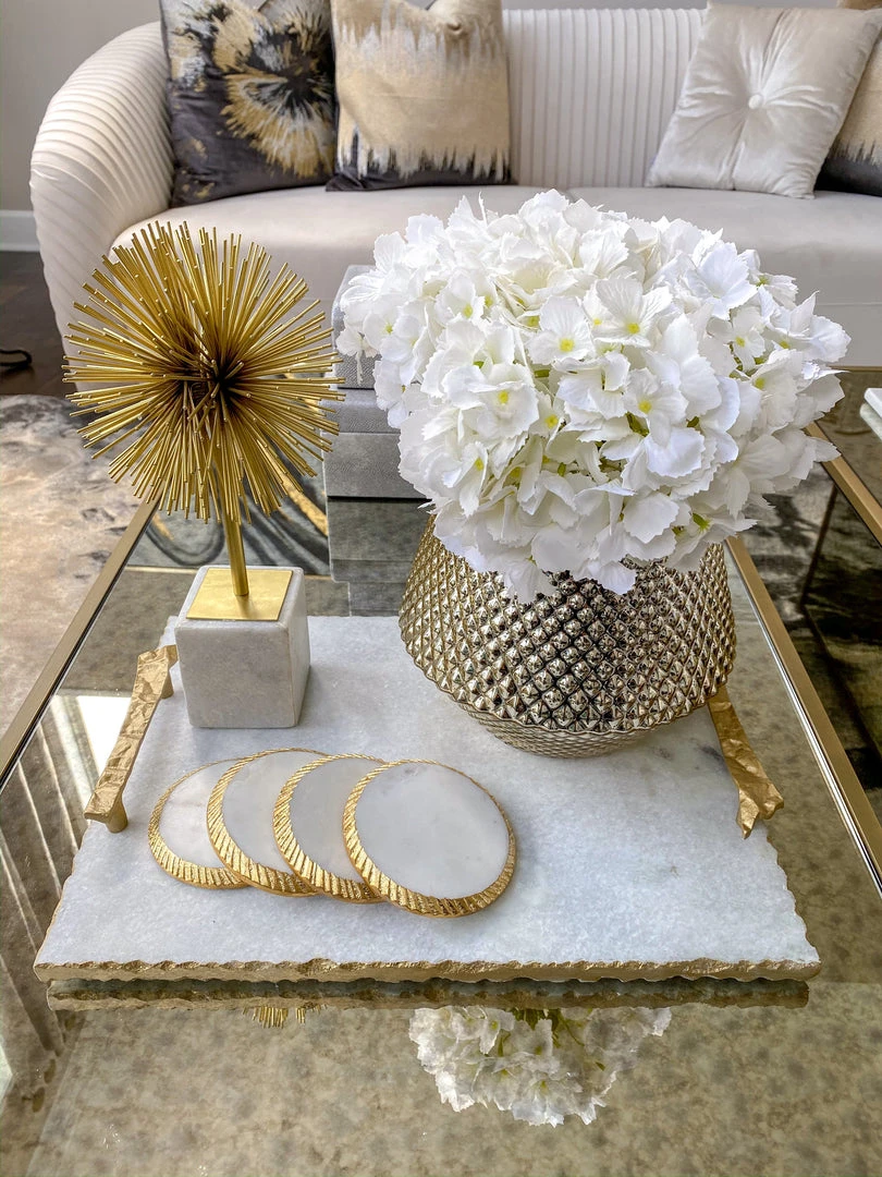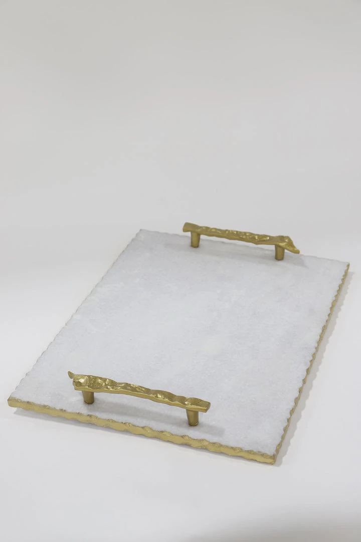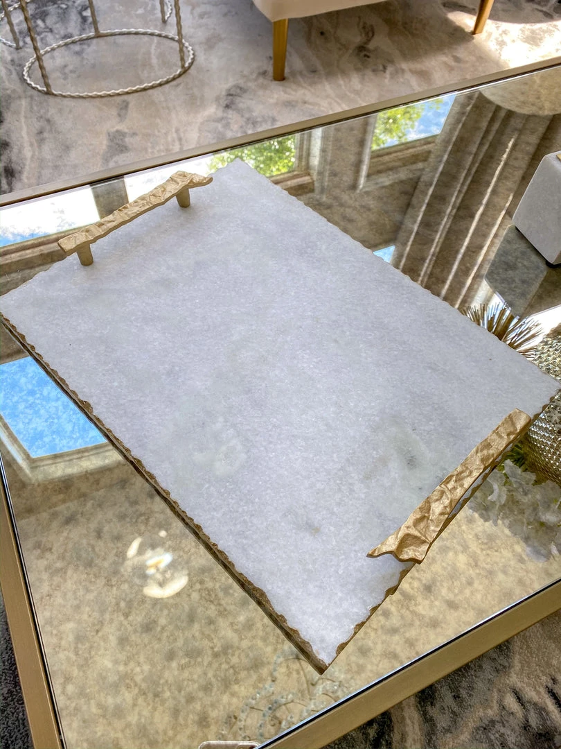 A white marble tray with gold crumbled handles. A statement piece, perfect for displaying hors d’oeuvres or other beautiful decor pieces.