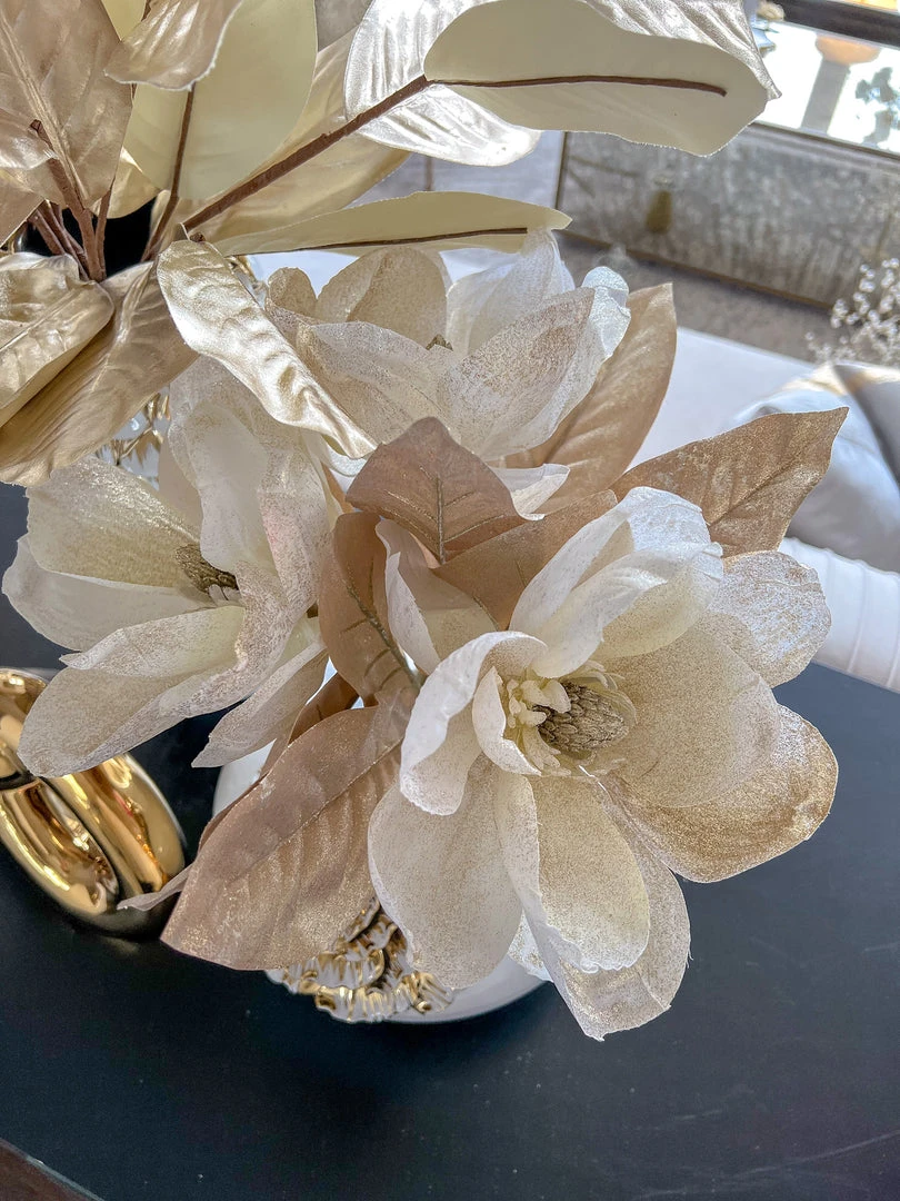 Description: This beautiful faux white magnolia will add sparkle to your holiday display or during any season! The stunning color will add a pop of color to any room.