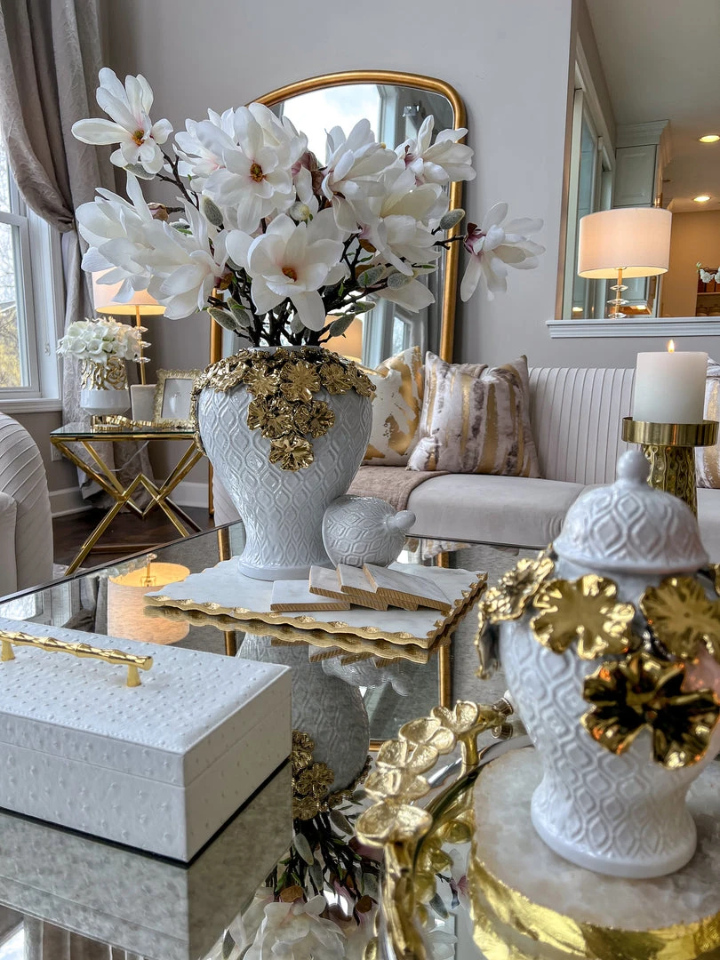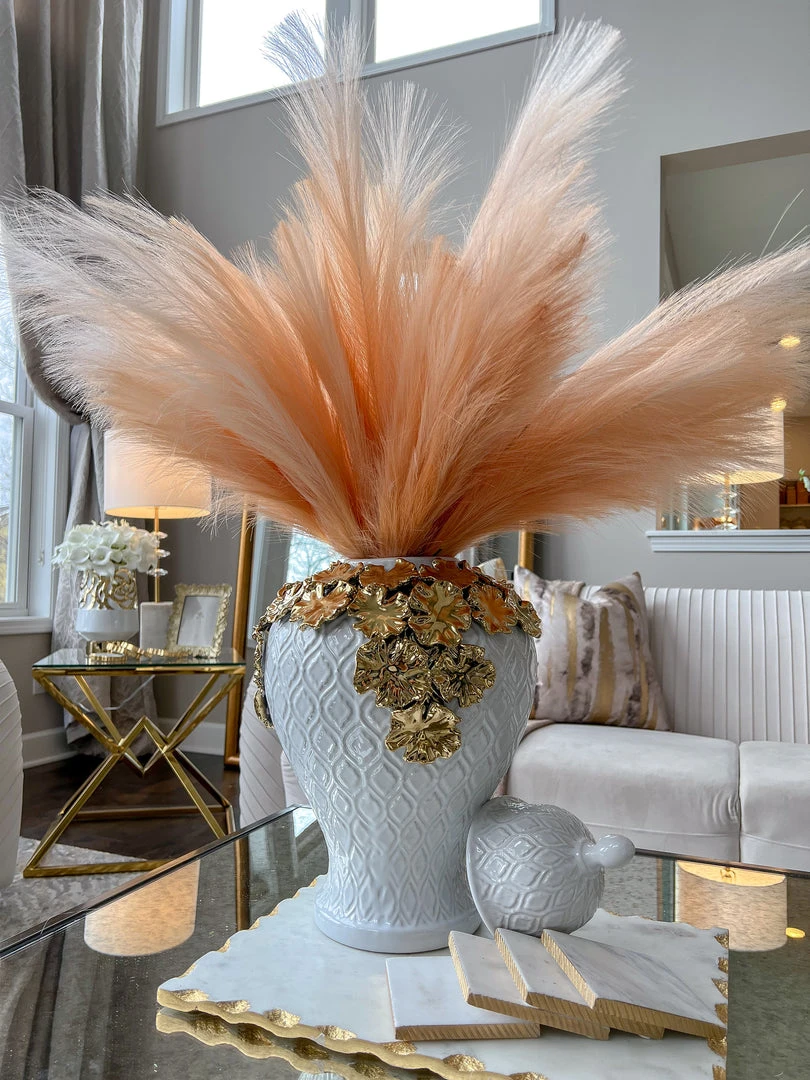 Description: These white textured ginger jars with their gold floral details are simply stunning!