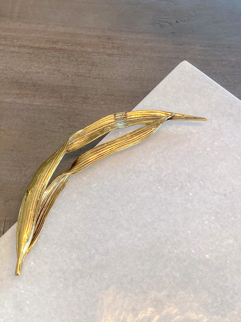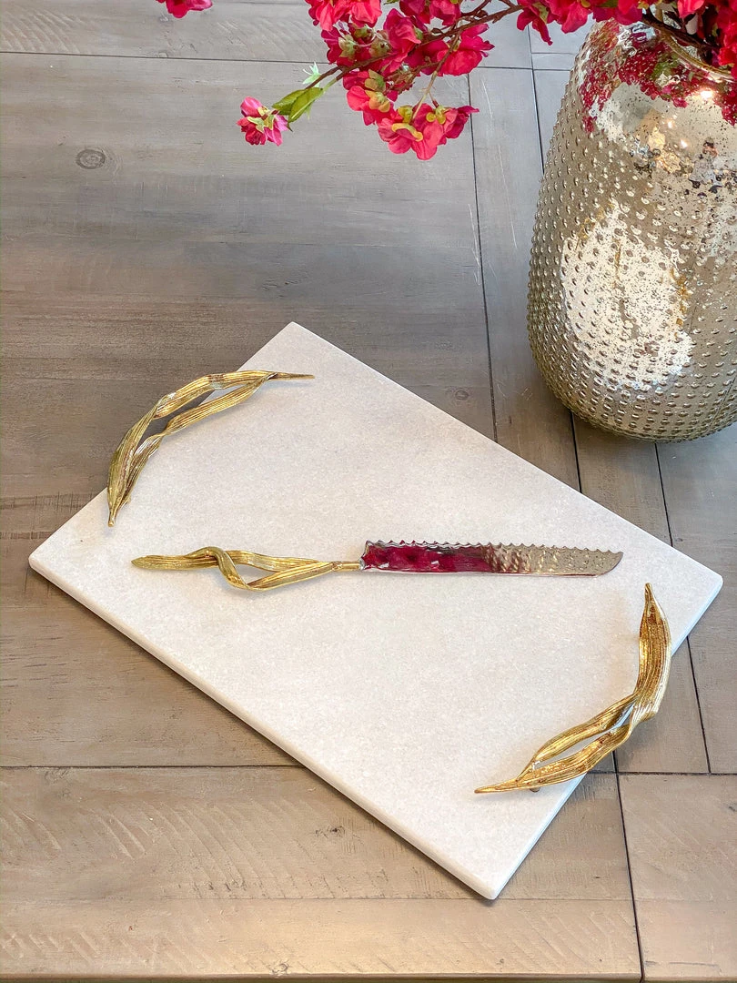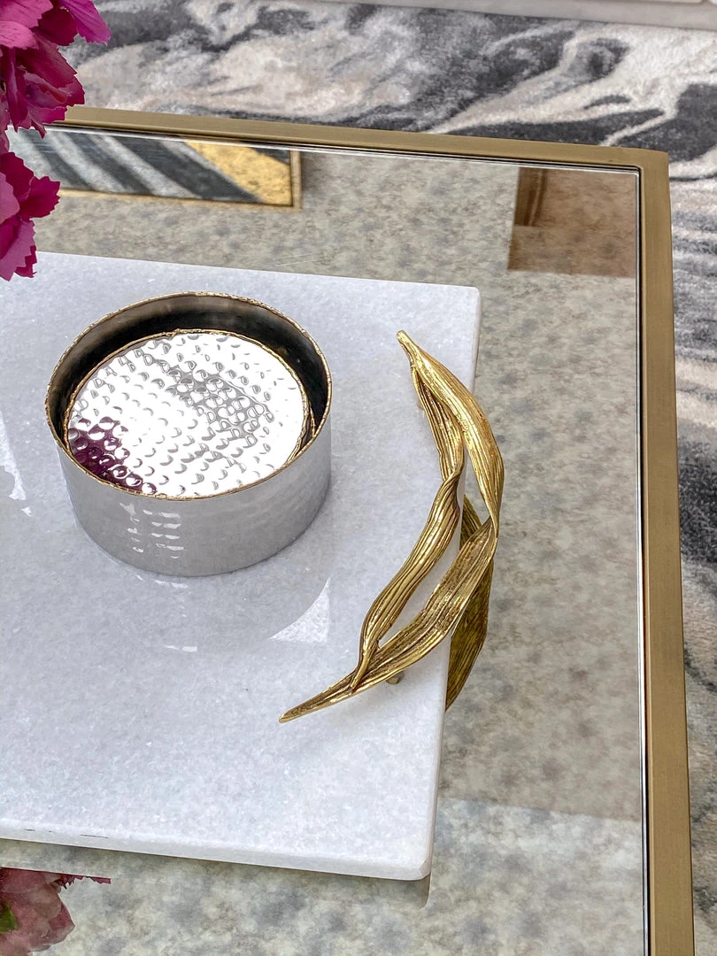 This white marble tray features beautiful gold handles shaped as thin leaves. Perfect for displaying hors d’oeuvres or other beautiful decor pieces.